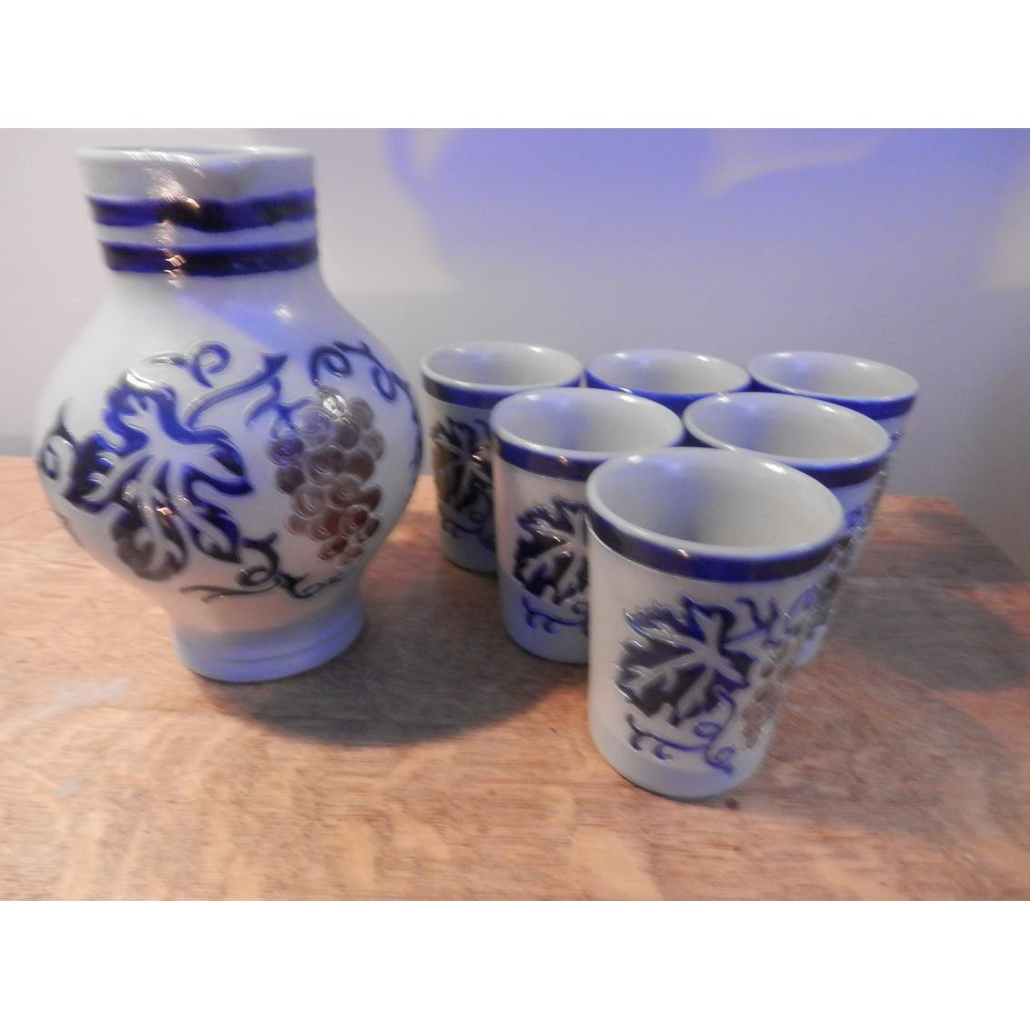 Goebels Merkelbach salt glazed wine jug with six tumblers all featuring a grape motif
