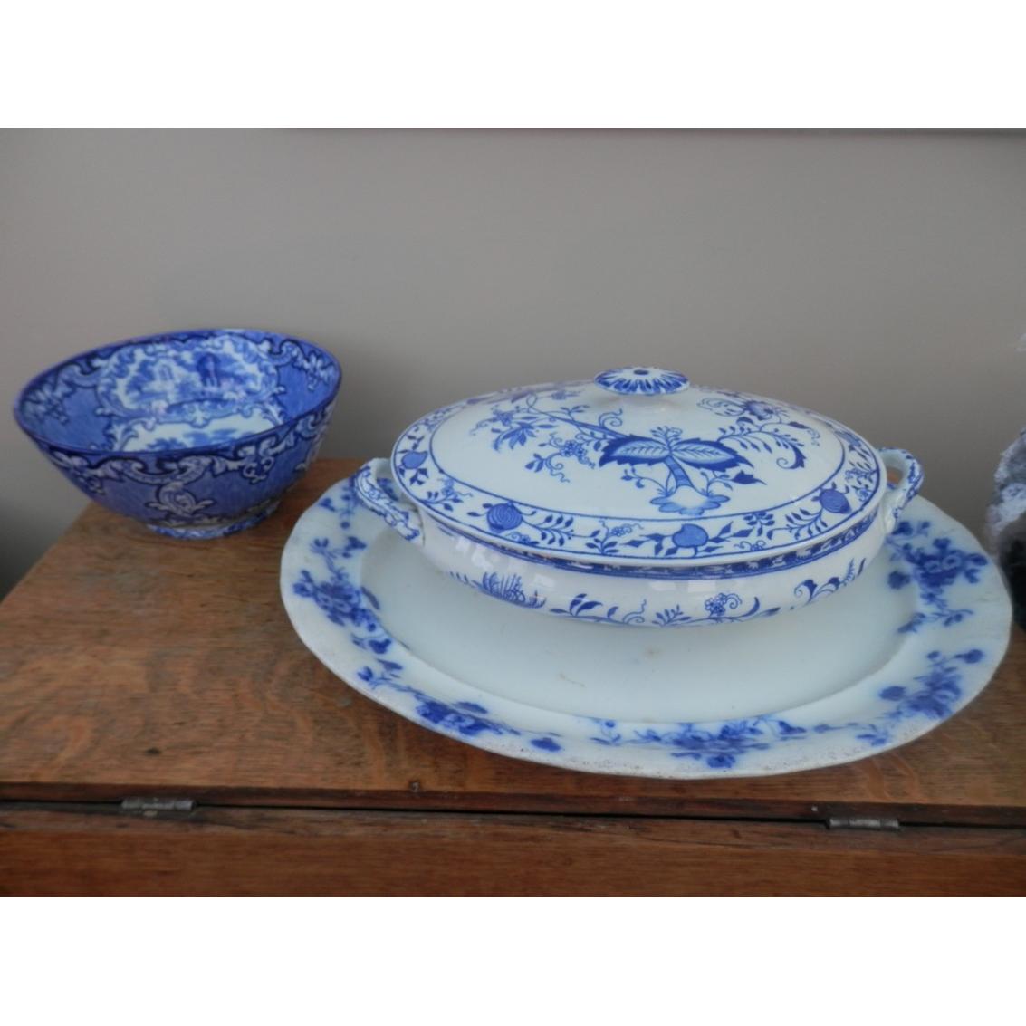 3 pieces of blue and white porcelain including an 1890s Furnival Ashet in Carnation design, George Jones and sons "Abbey" design bowl and Grimwades Carro eentree dish with cover