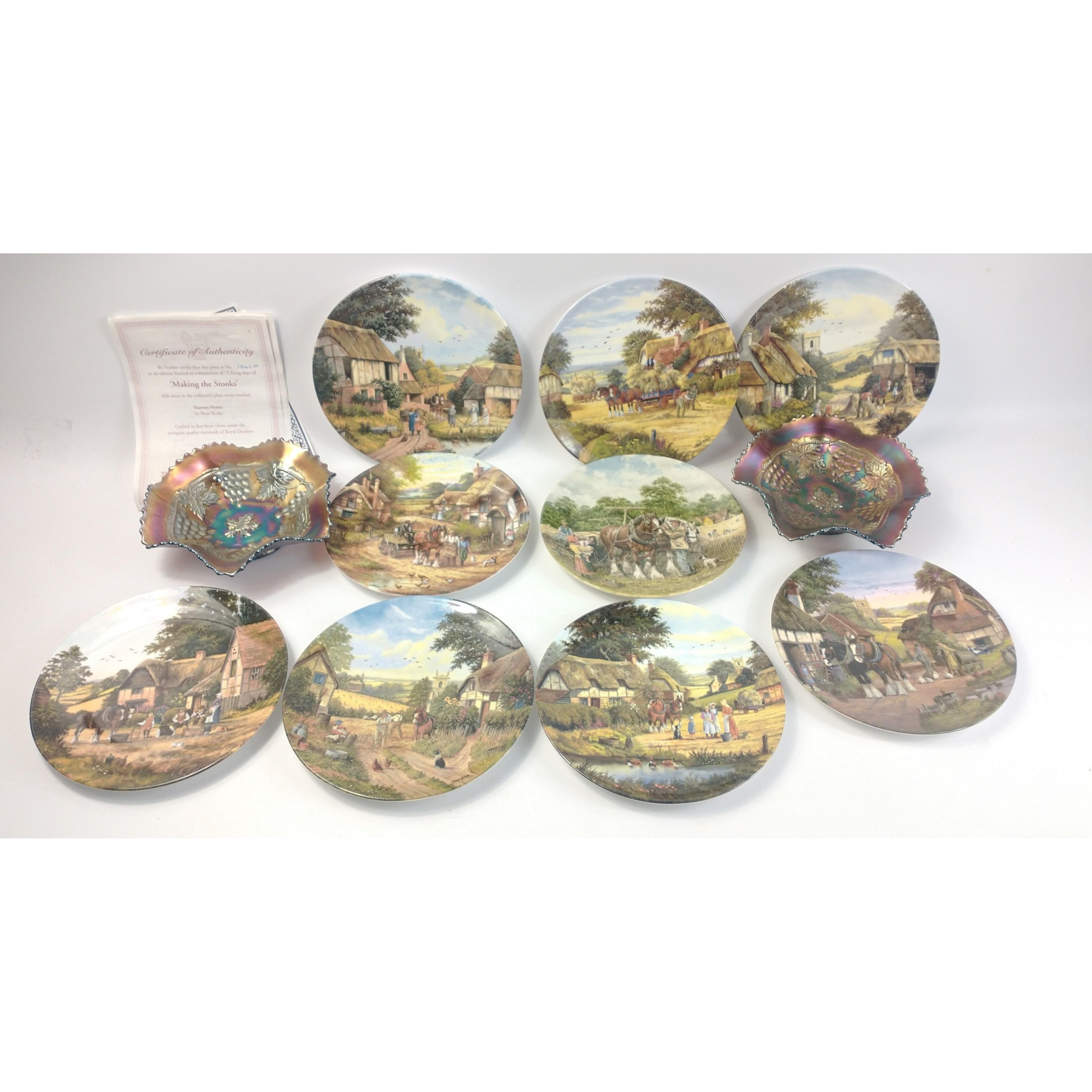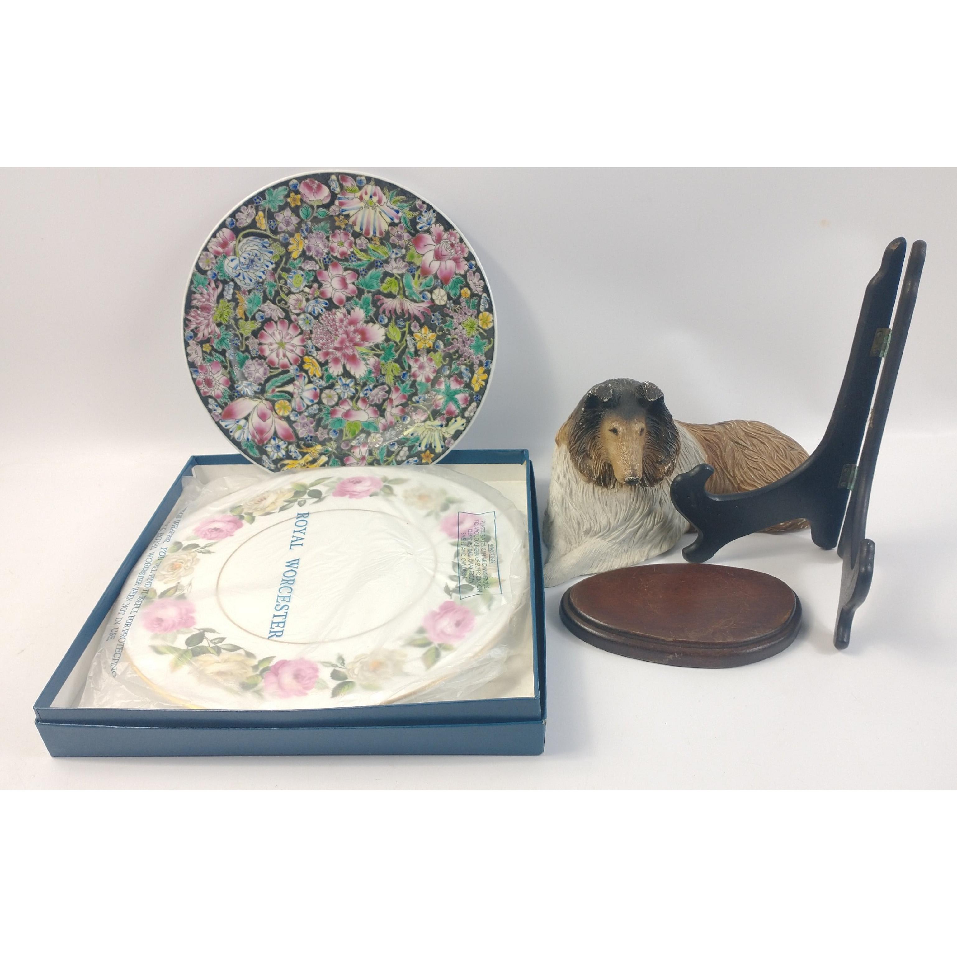 Decorative items to include a boxed ROYAL WORCESTER Royal Garden cake plate, a SANDICAST sculpture of a collie from San Diego approx 26cm long (some light flaking from the paint finish) and a highly decorated Chinese plate (26cm dia)