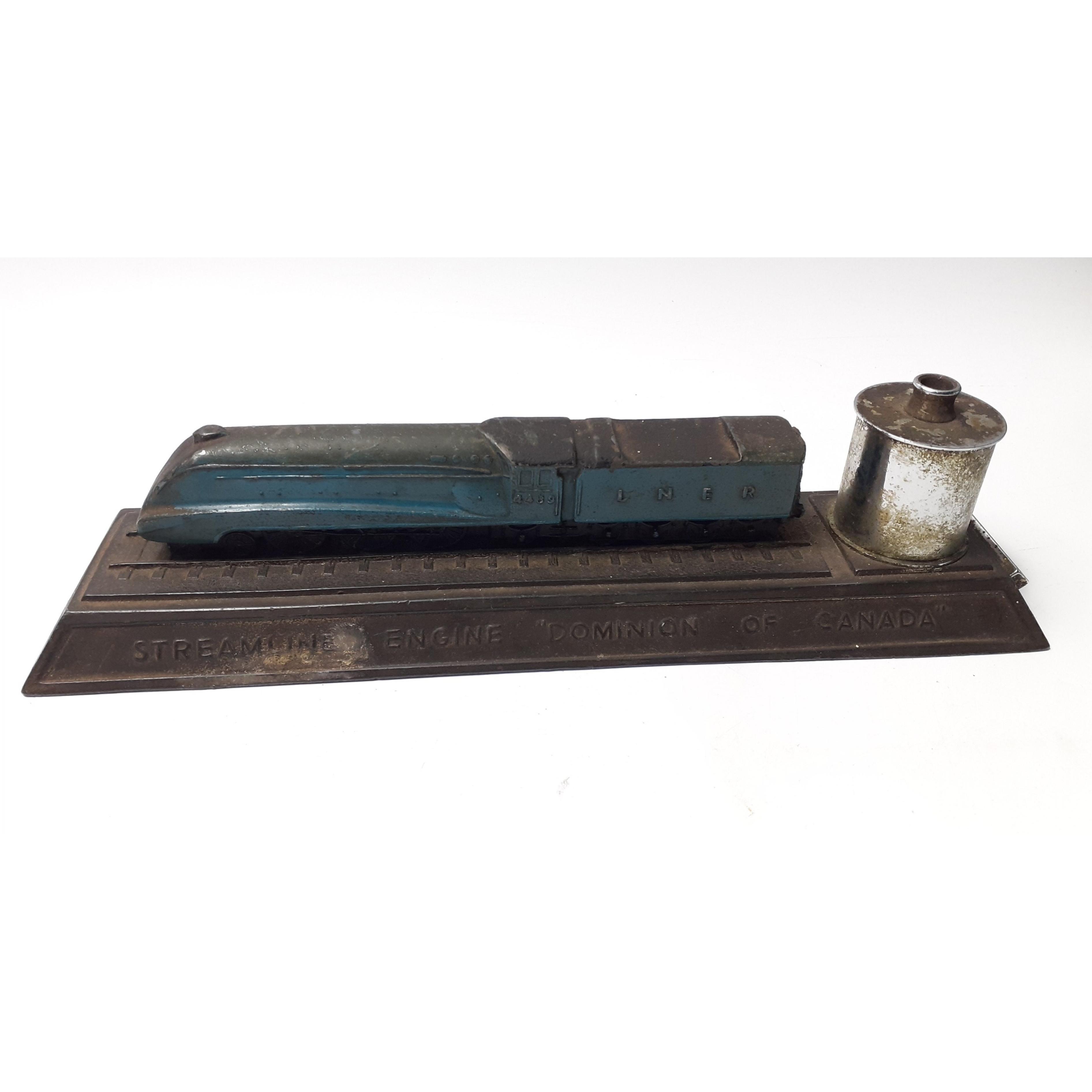 Two vintage collectable metal piggy banks, one cast iron, the other with the patent number 601362
