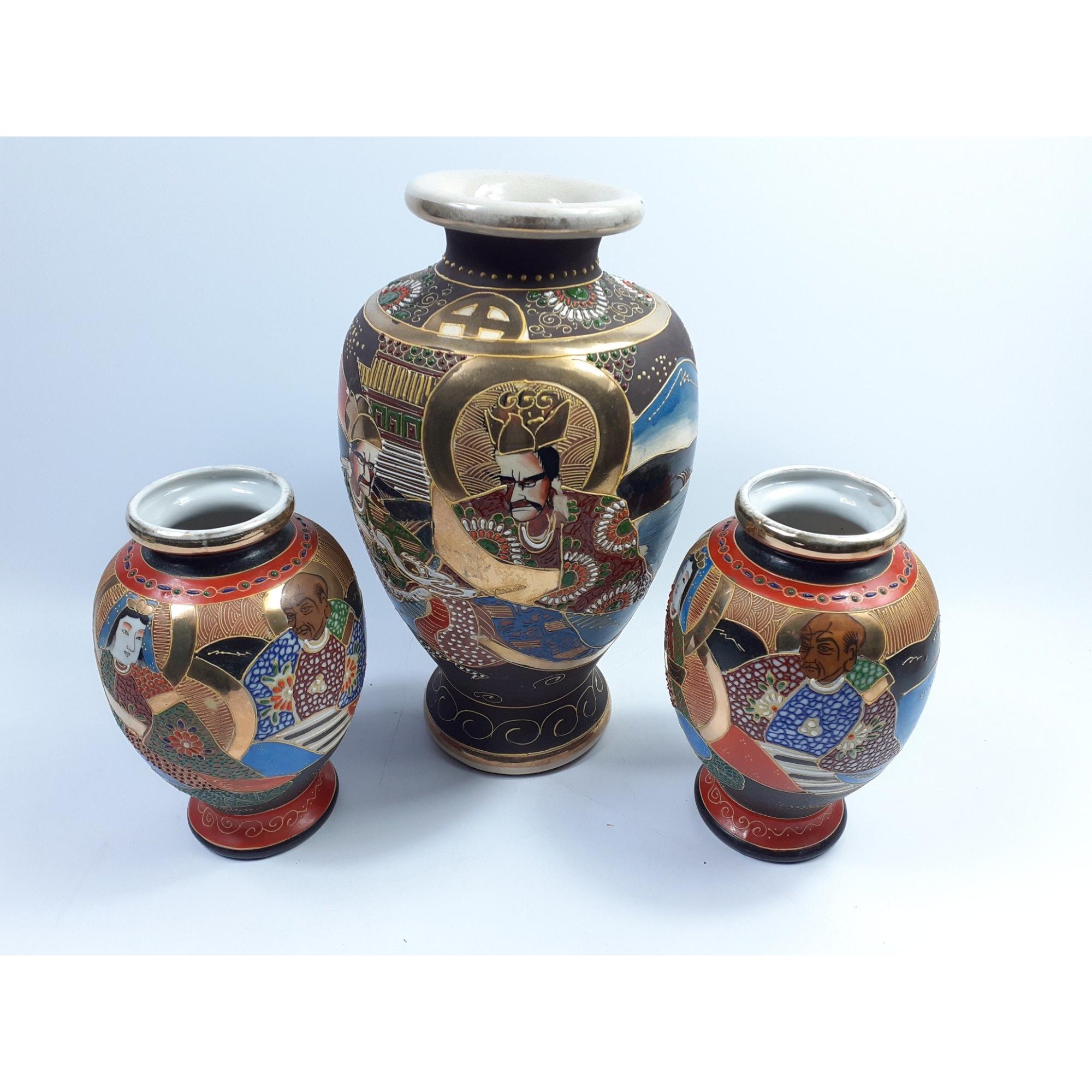 Three Japanese satsuma-style vases one 31cm, two others both 20cm tall approx