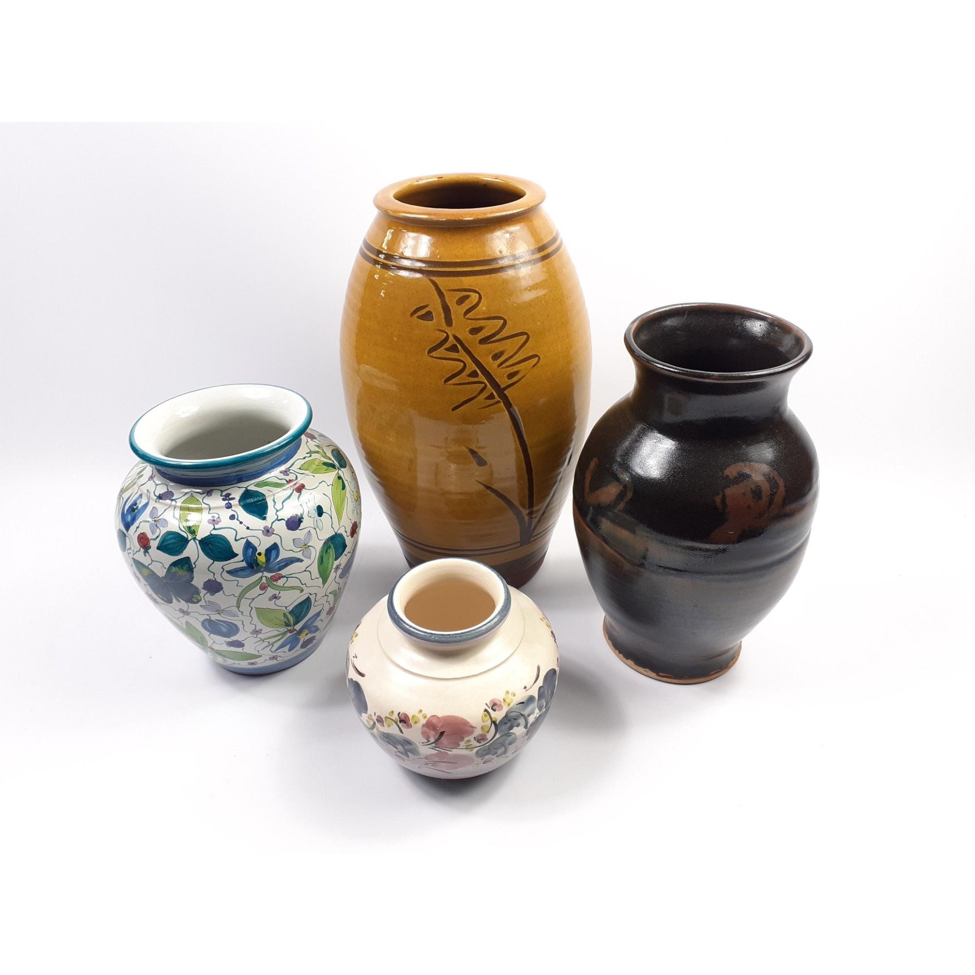 A mixed collection of vases to include one cream based with overall flower design signed STEDAV ASSISI' to base 20cm high, a large mustard coloured pottery vase with an abstract pattern of bulrushes, 33cm tall, a heavyweight dark brown pottery vase 25cm tall with initials 'SK' to base, a small vase with a floral pattern on a cream base, 13cm tall,