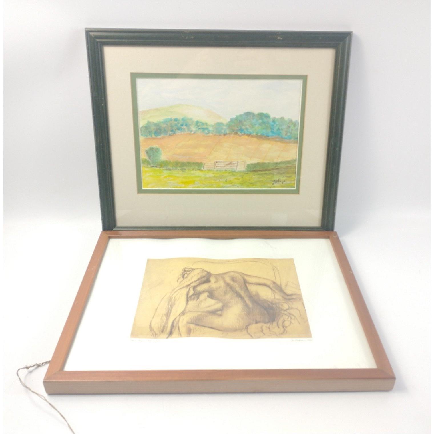 A mixed box to include a large green mixing bowl (33cm dia), an old-style supermarket pate dish, a print of a male torso (frame size 42x32cm), a mixed collection of blue glassware, a 6 person tea service by EMPIRE ware with milk jug, sugar bowl and sandwich plate, white with gilt design, some damage to cups and a copy of BARTOLOMEW'S GAZETEER of the British Isles 1887