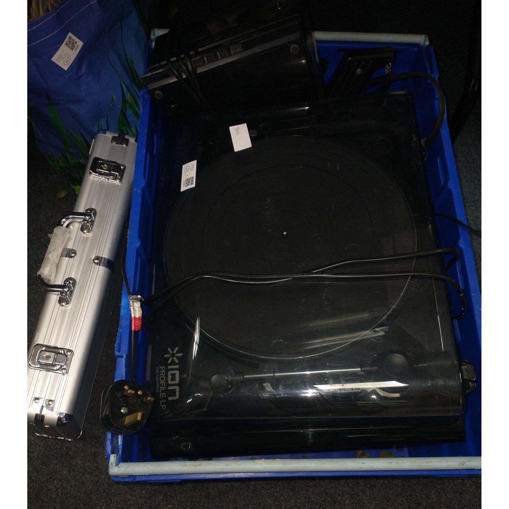 A mixed box to include a REALISTIC cassette player, an ION USB turntable and a photo to digital picture converter, an unused boxed poker set with chips etc