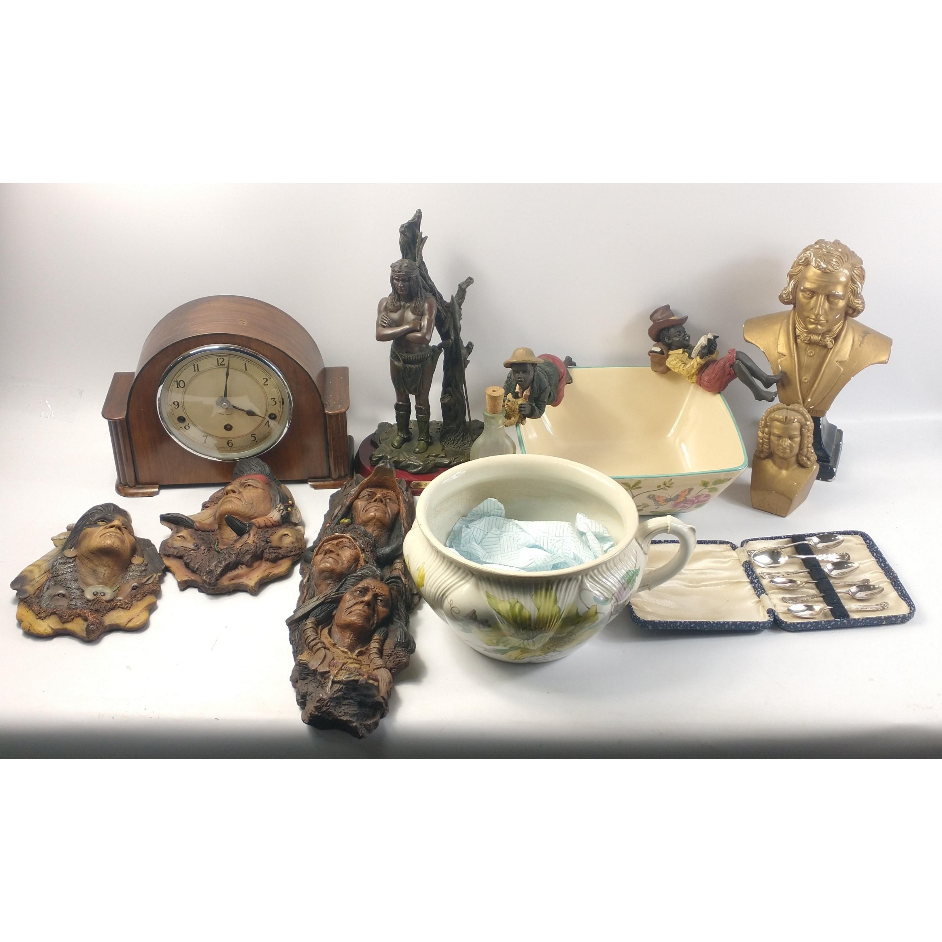 A quality mixed box to include wall plaques by Collectible World Studios 'Patient Wind' , Autumn Wind dimensions each 20cm x 17cm approx, another Red Indian wall plaque possibly same maker 42cm height approx, other models to include a standing Native American Indian Brave Warrior on a plynth 33cm tall, two busts, a VINTAGE FOLEY china chamberpot and a vintage mantle clock etc