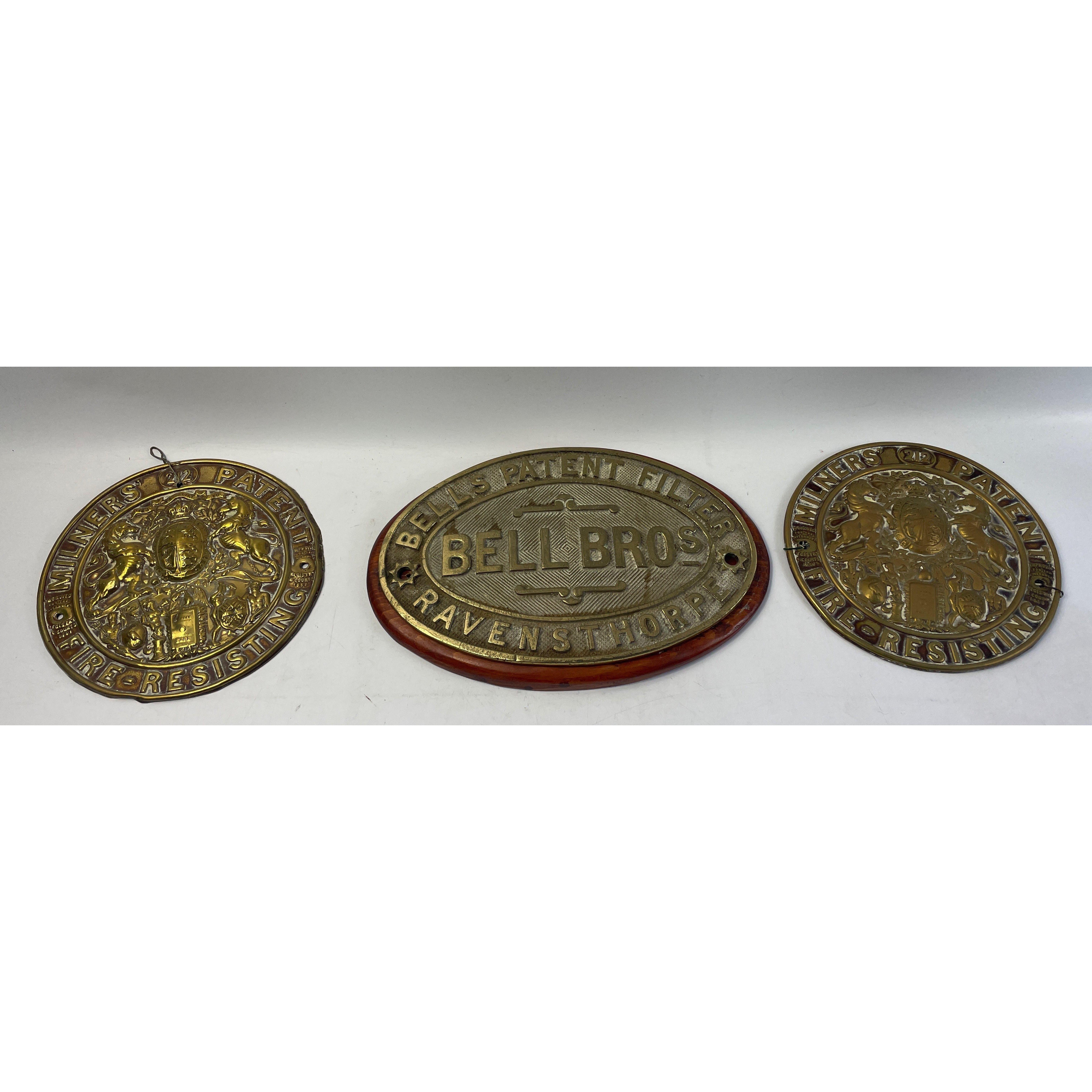 A pair of antique brass Boiler and Insurance wall plaques plus a BELL BROS of Ravensthorpe Patent Filter largest dimension 30cm x 20cm oval sign, and the round one 20cm diameter approx