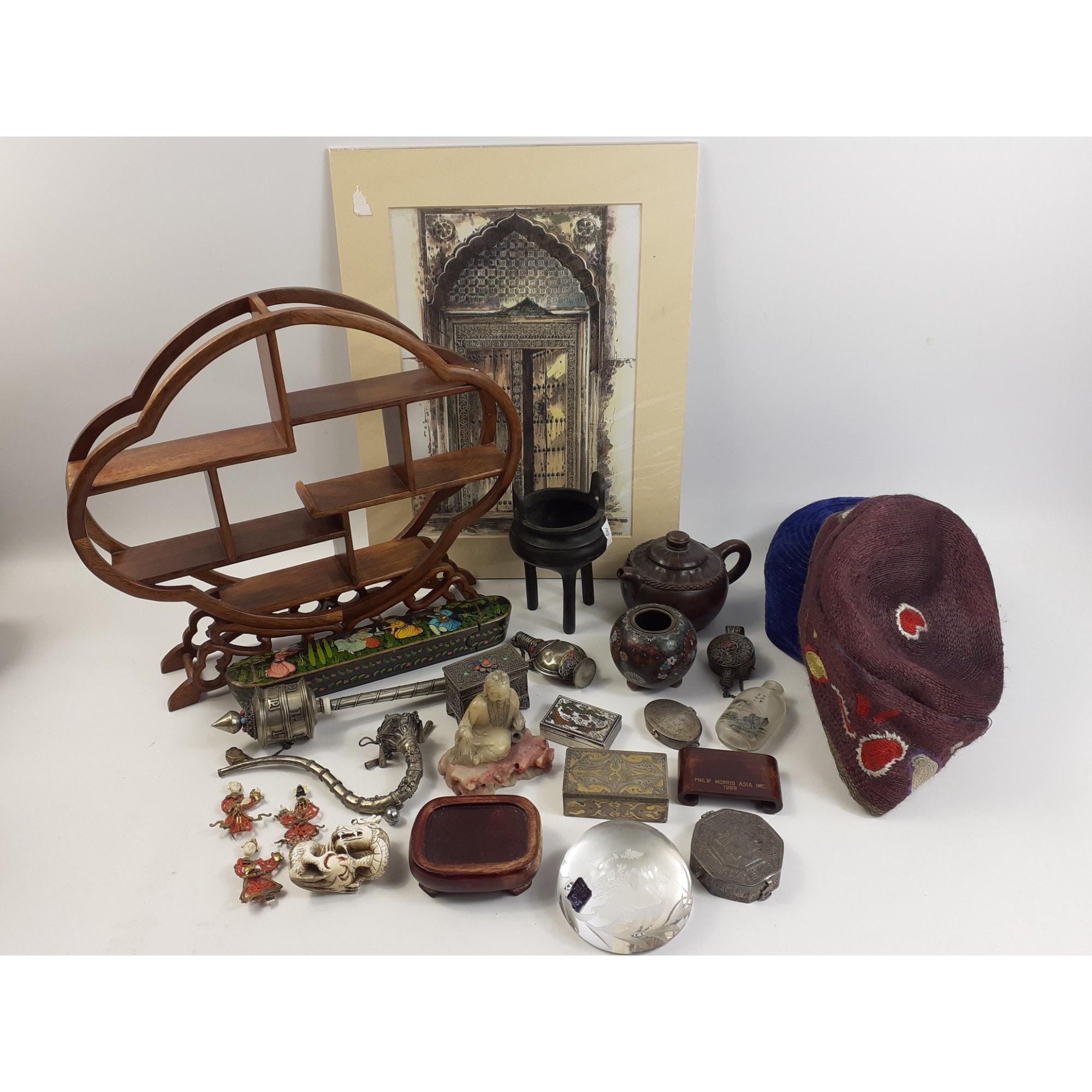 A mixed box to include a small jet teapot and milk jug (chip to spout of jug), 2 sets of four crystal liqueur glasses, a glass chalice (16cm high), a small Chinese bowl (9cm dia) and sauce bowl (8cm dia), a vintage ink blotter, a frosted marble bowl (15cm dia), a reproduction Davenport serving dish garnished with grapes (28cm long), a carved wooden figure (13cm long)with damaged foot, a carved wooden hippo (30cm long) largely toothless