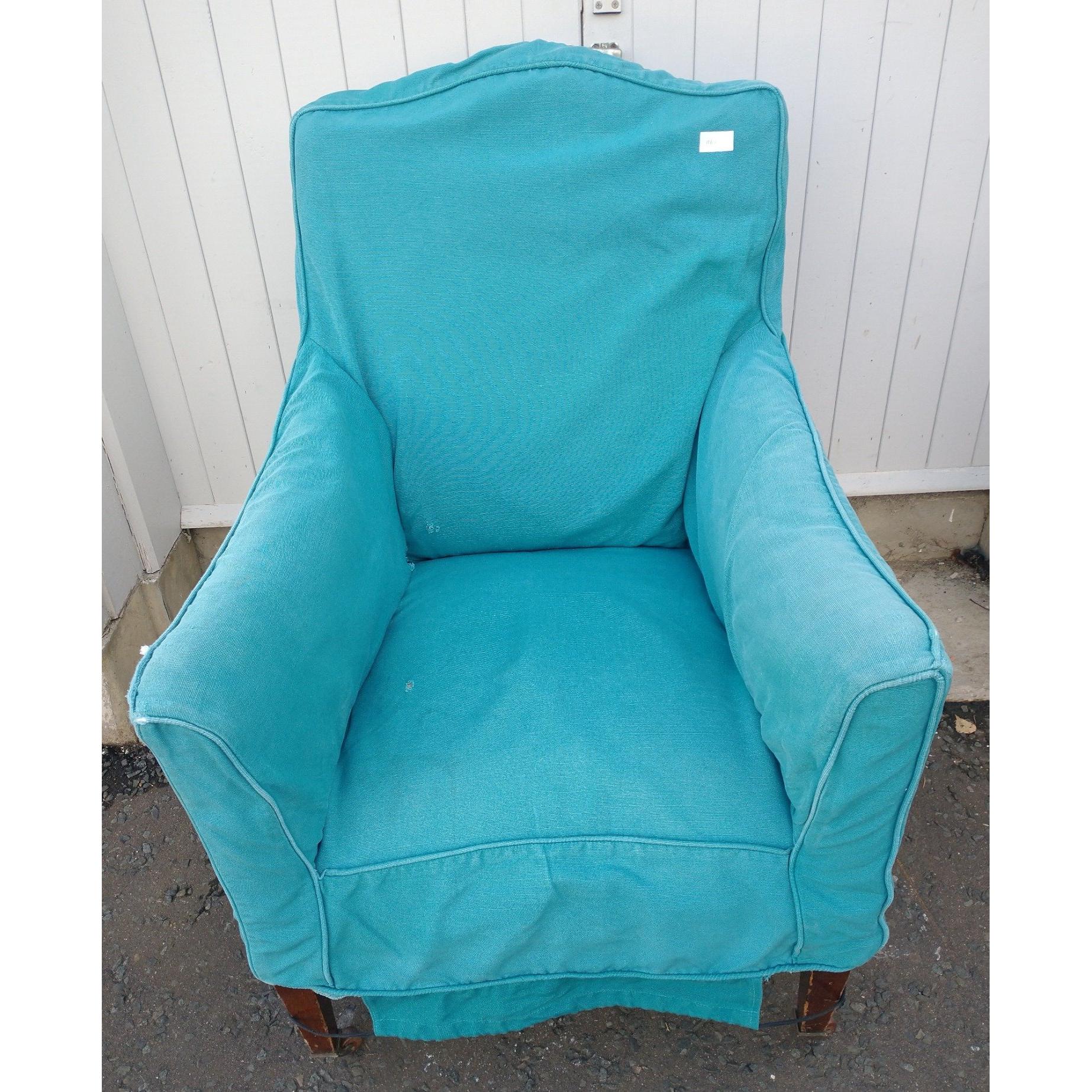 A vintage ARMCHAIR with sprung seat and blue loose covers - a really comfy wee seat!