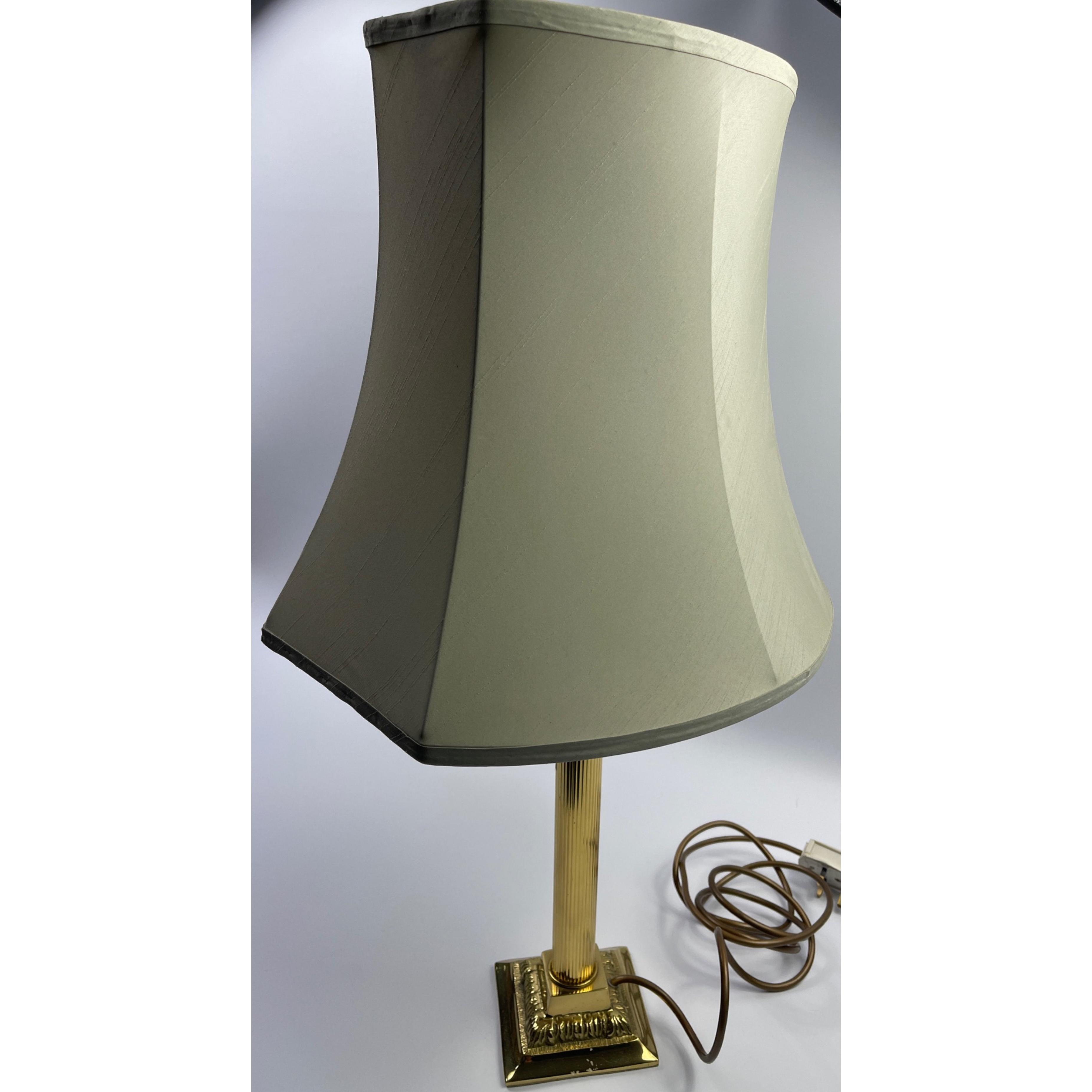 A nice quality brass CORINTHIAN columned table lamp with a quality shade - dimensions of lamp to the tip of the shade measures 64cm tall approx
