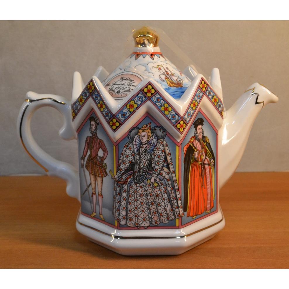 An unusual SADLER potter hexagonal shaped teapot depicting Sir Francis Drake, Sir Walter Raleigh, Lord Burleigh etc etc