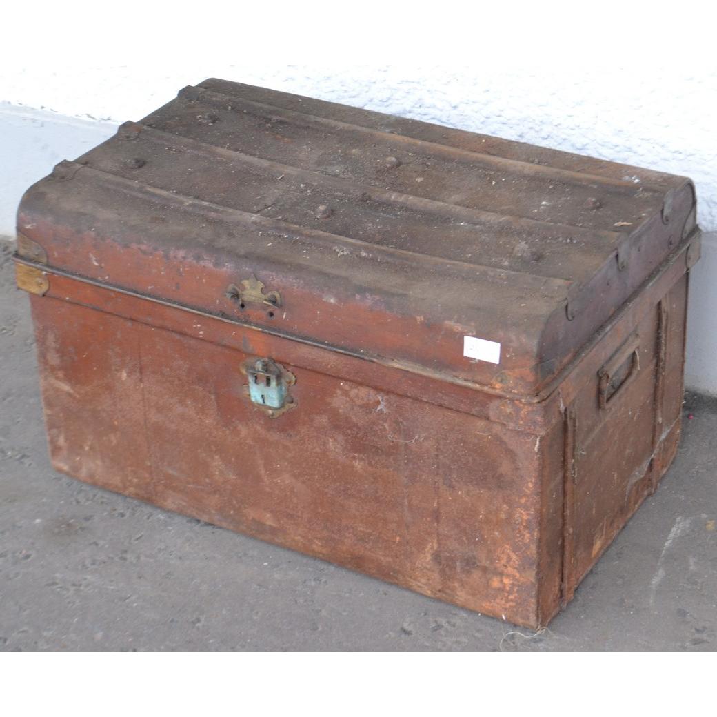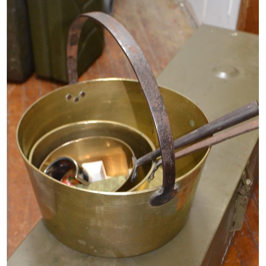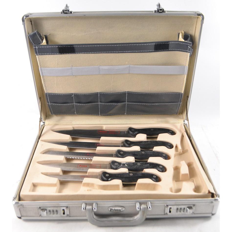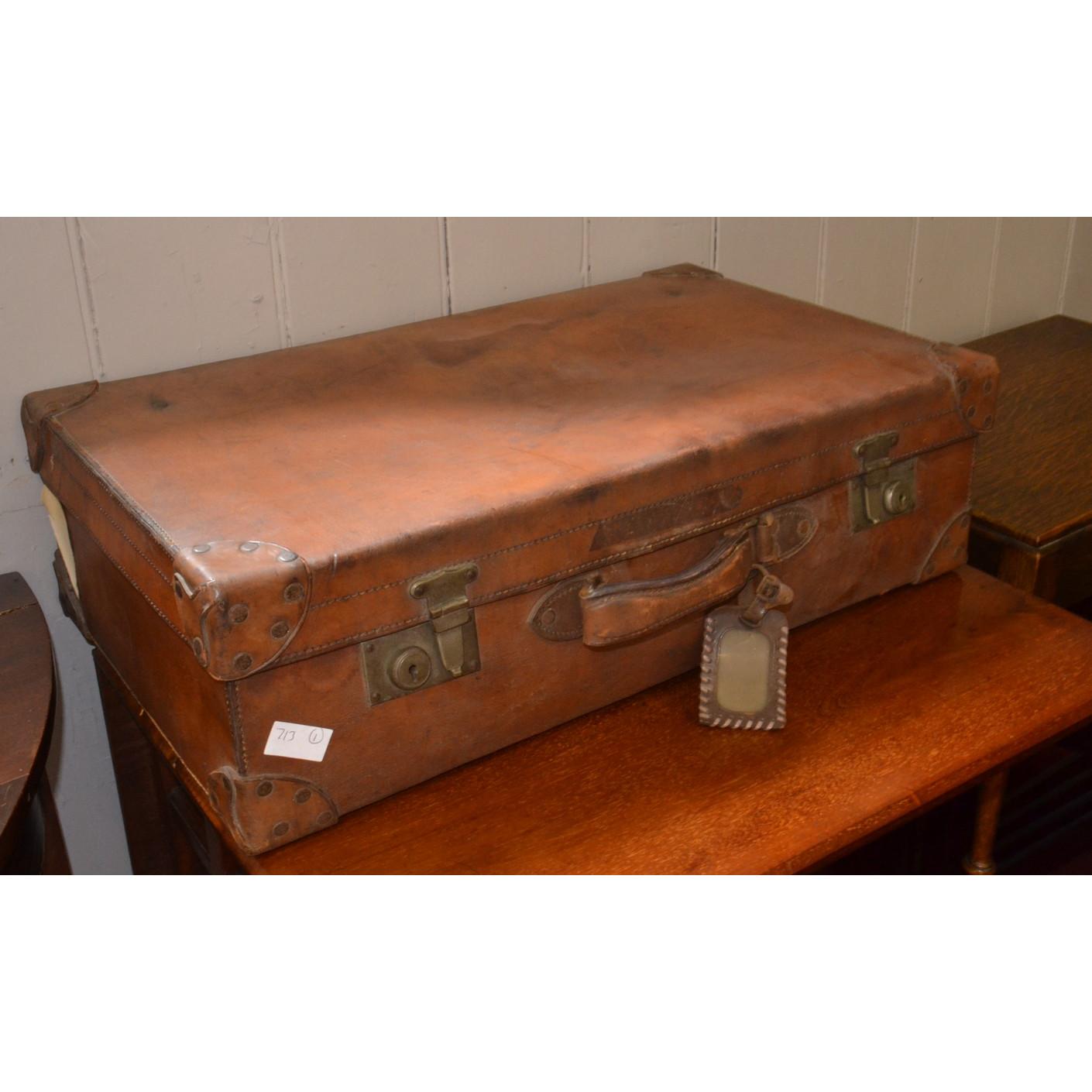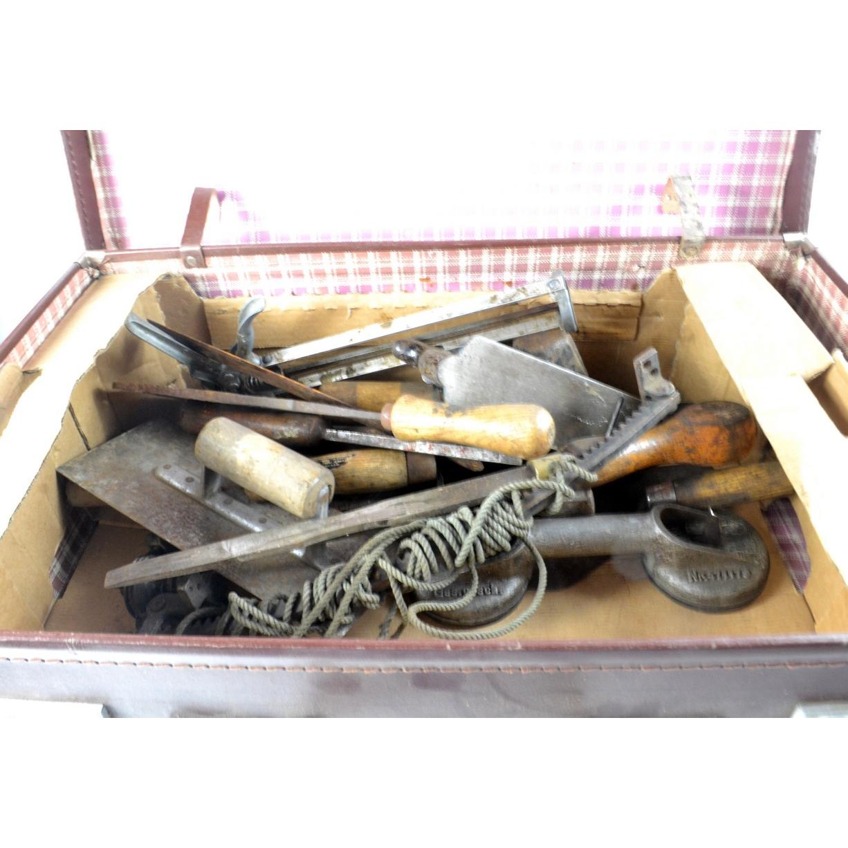 An old vintage suitcase filled with tools to include an old cleever, an old wood plane,