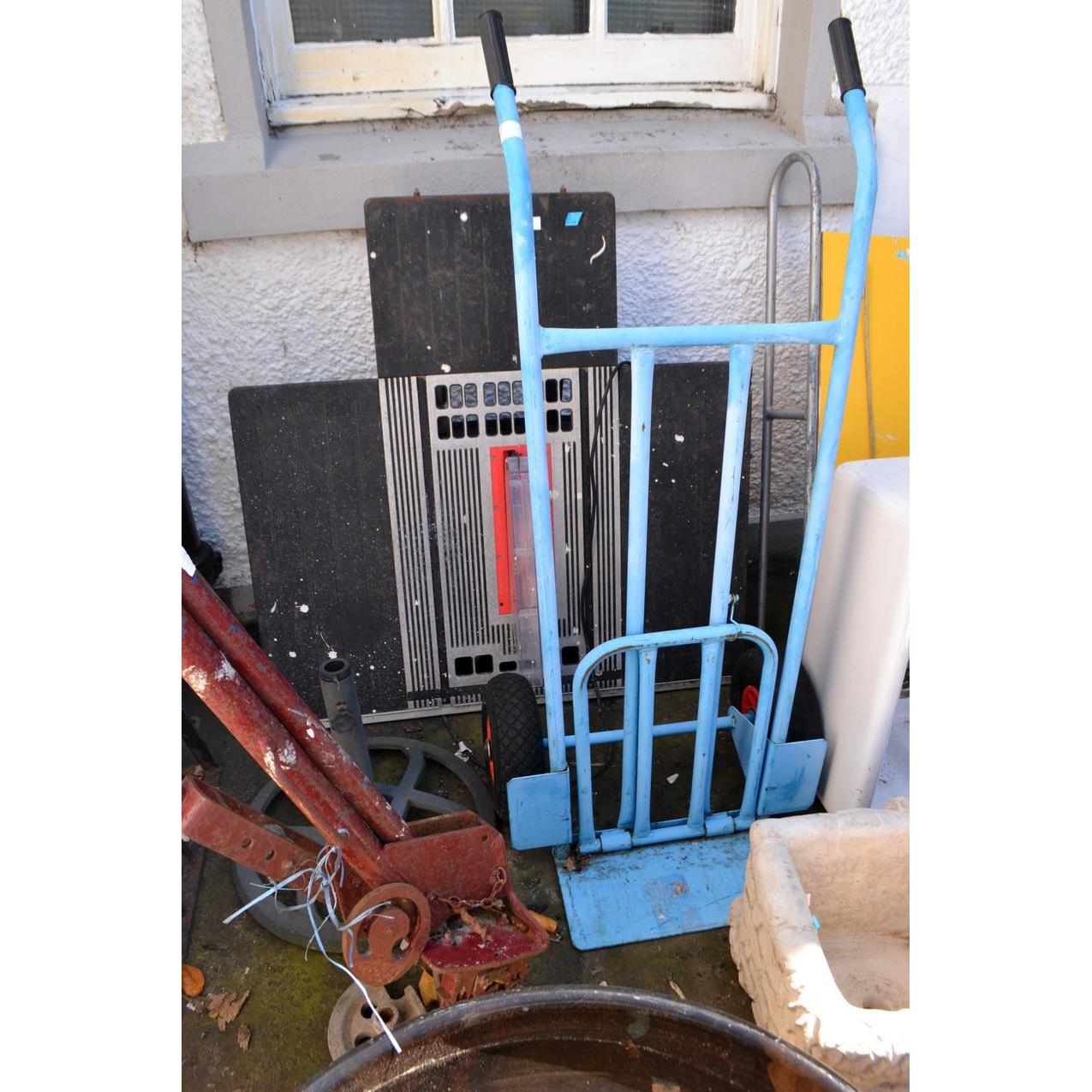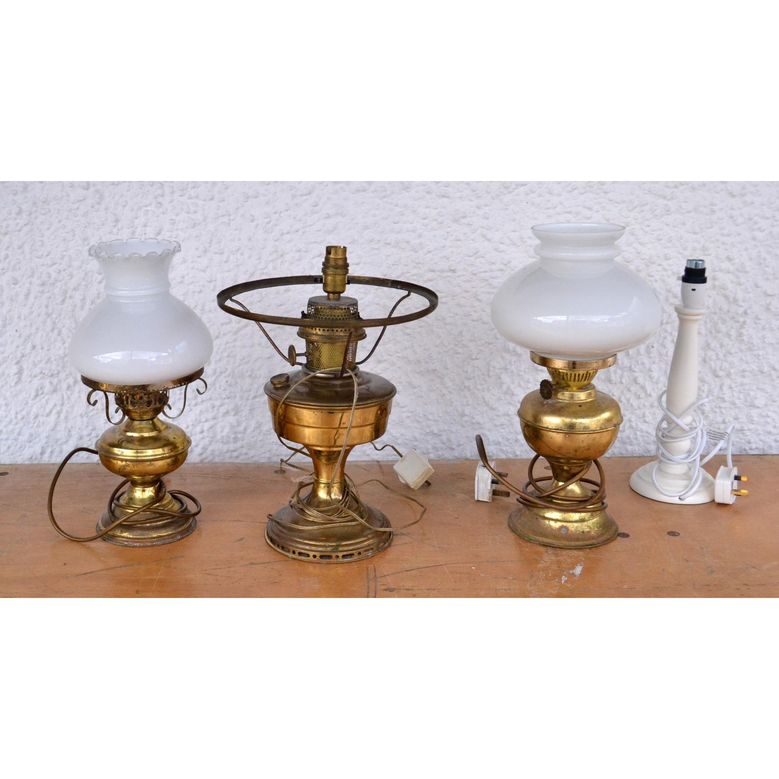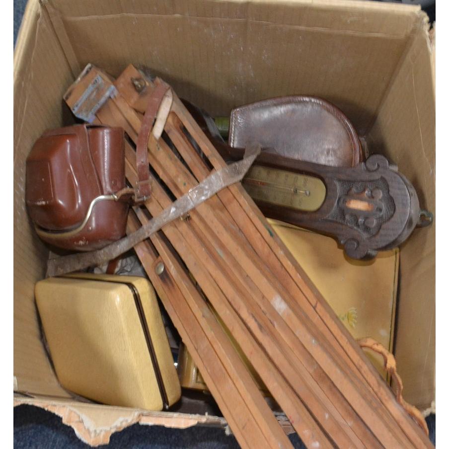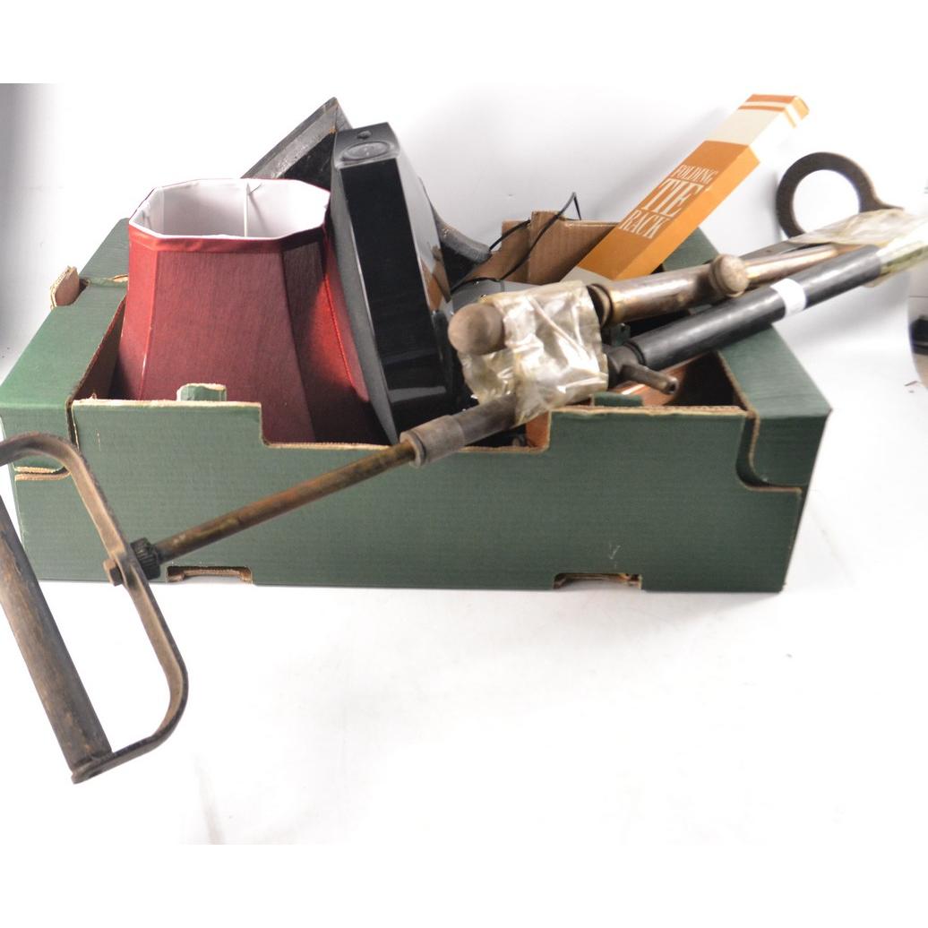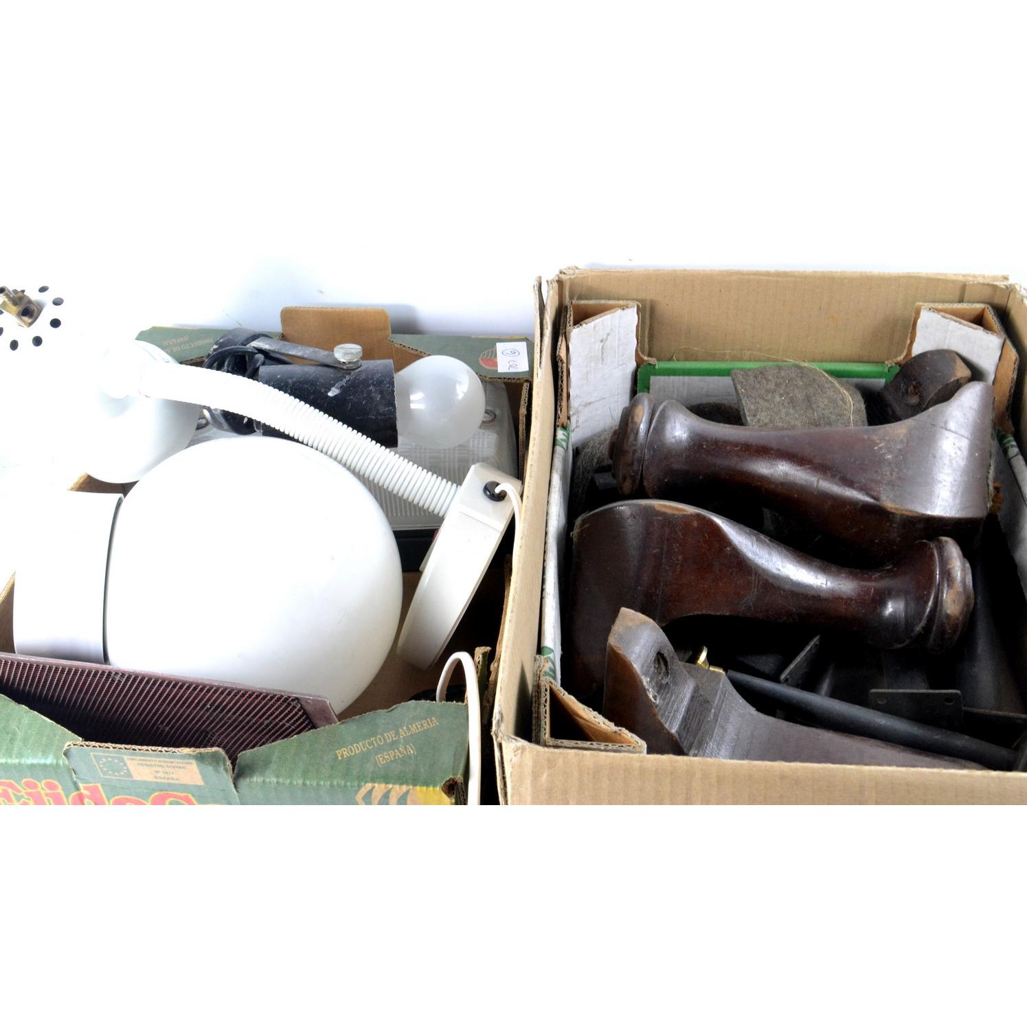 Old Queen Anne furniture legs and a box to include an angle poise desk lamp, bulkhead light etc
