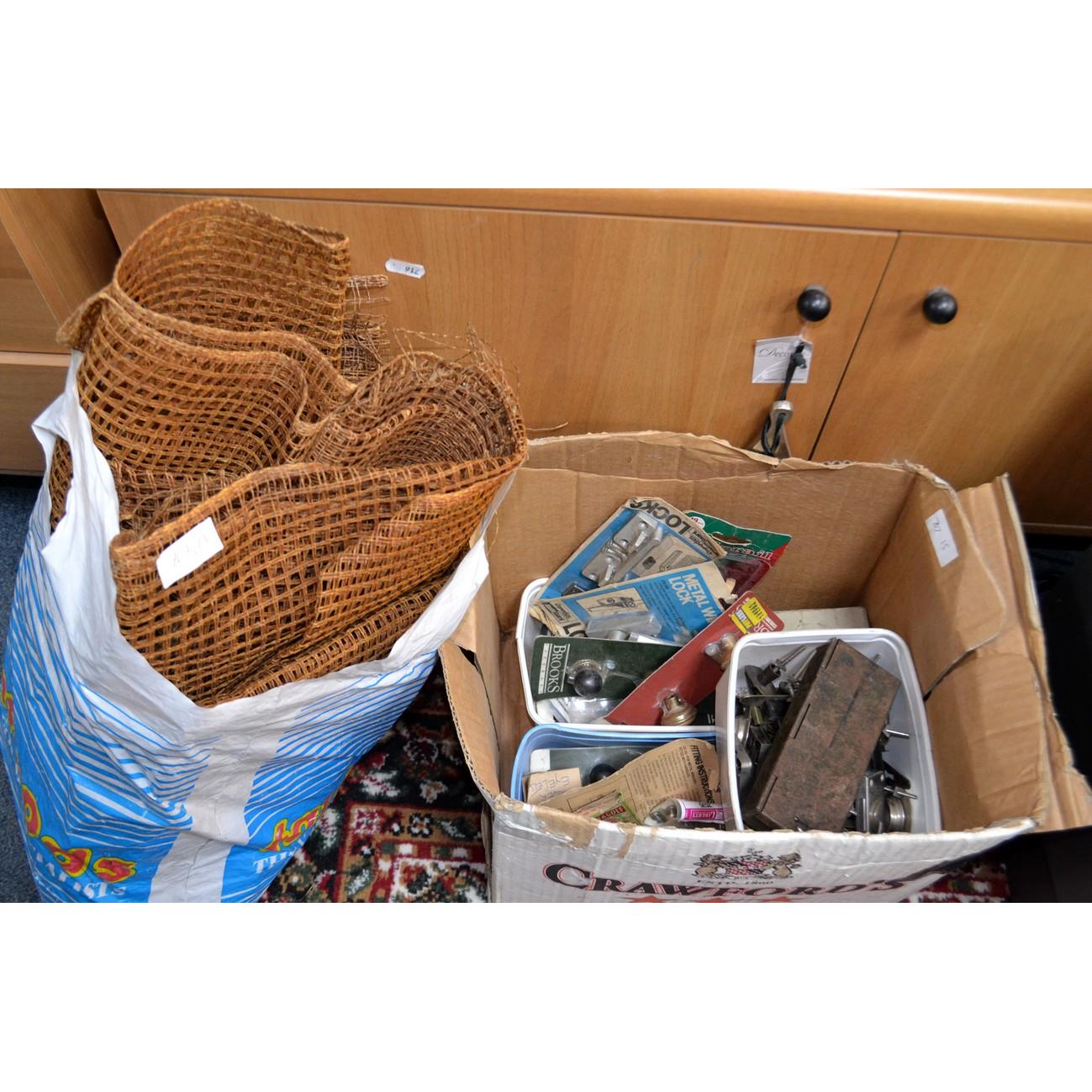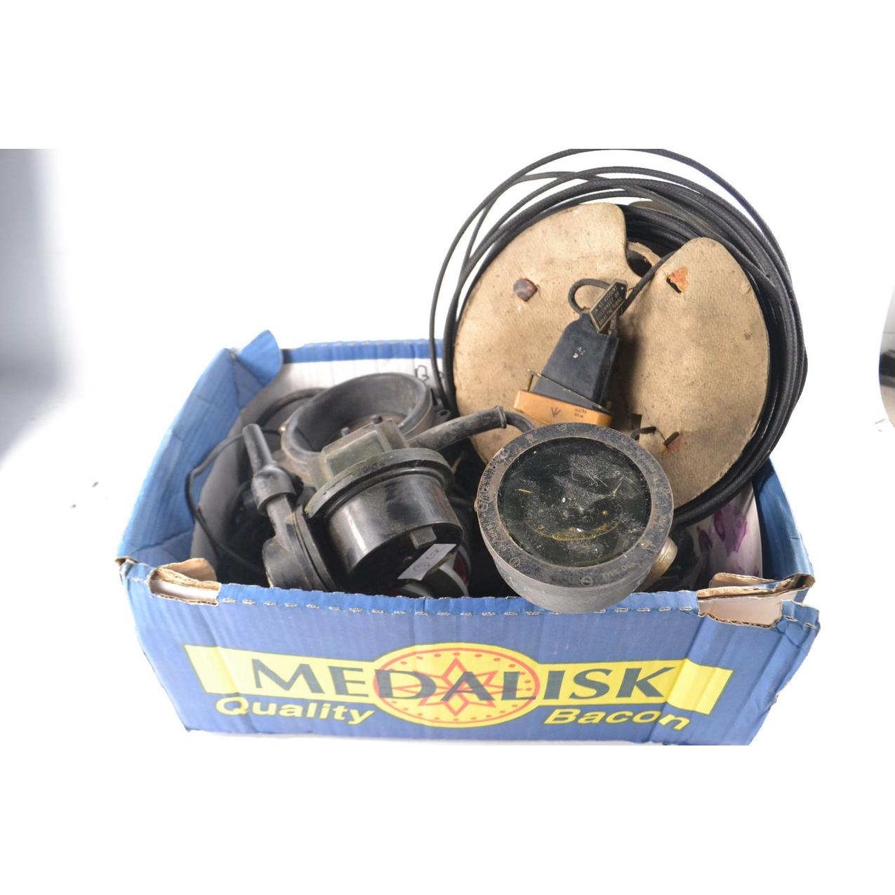 A mixed automobile box to include to include a small vintage car mirror, long arm mirrors for a vintage motorbike etc etc.