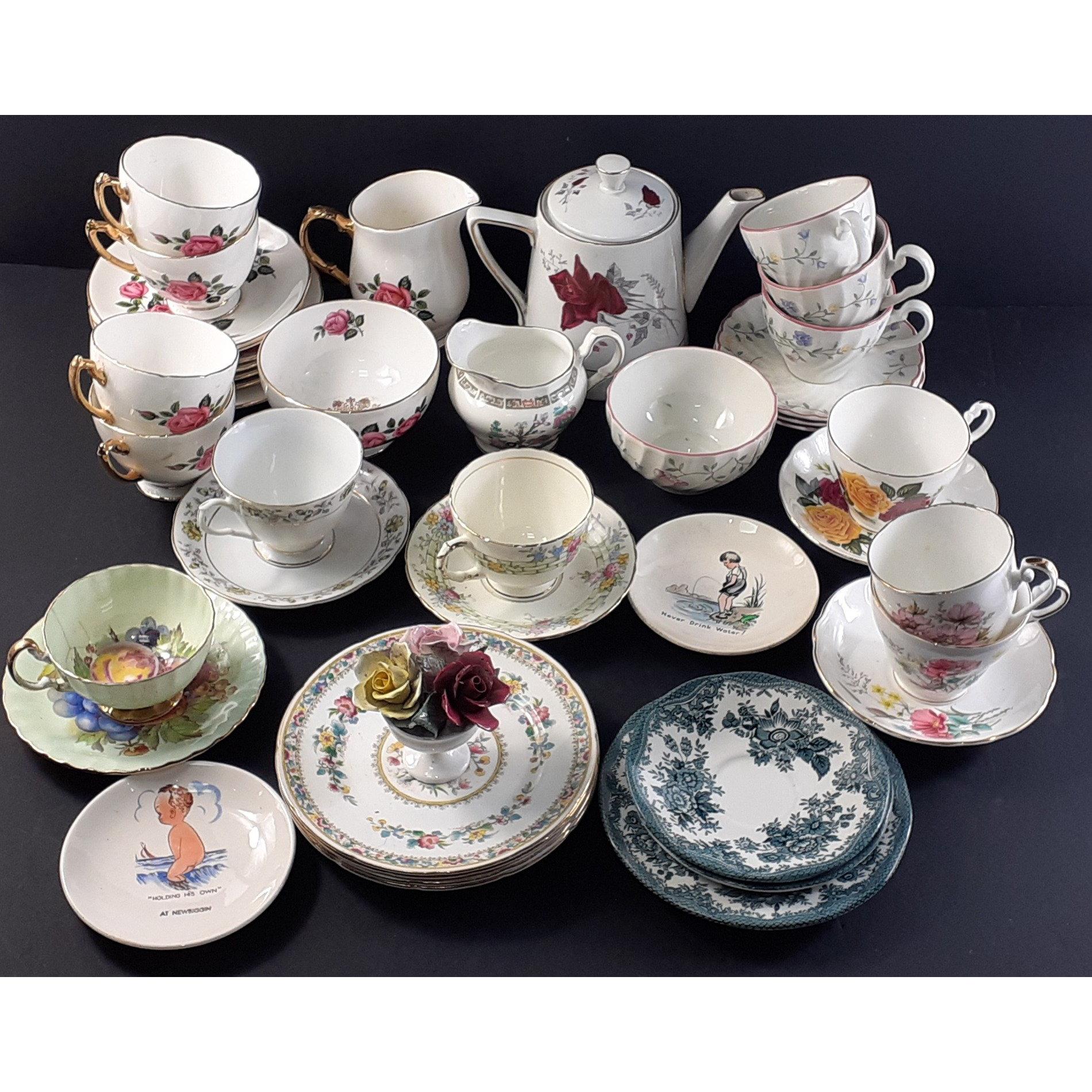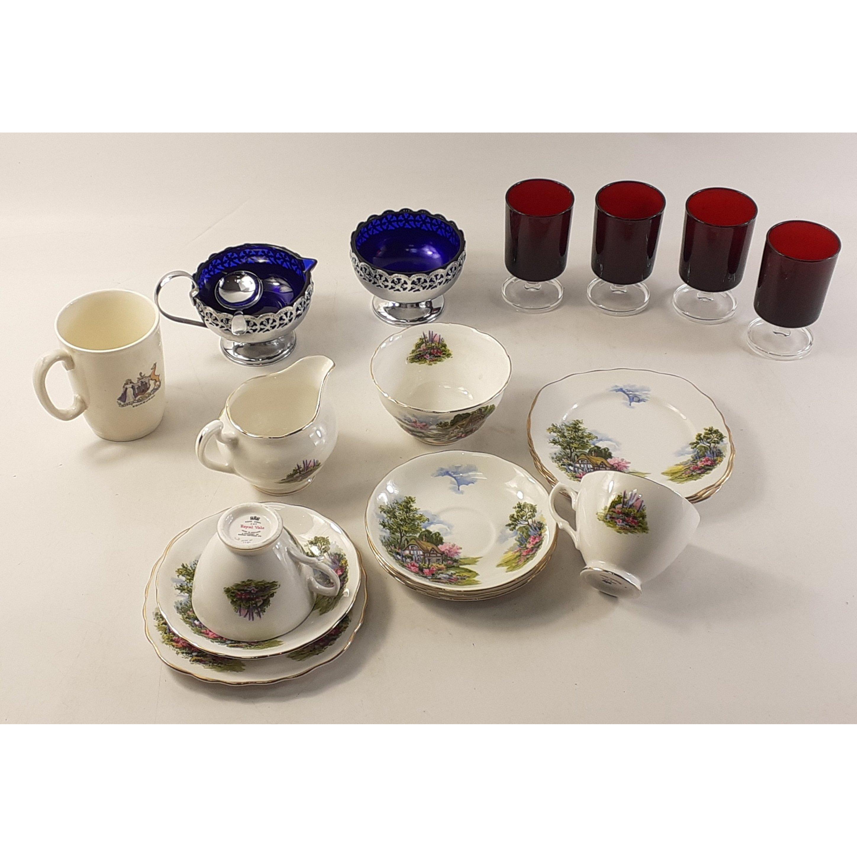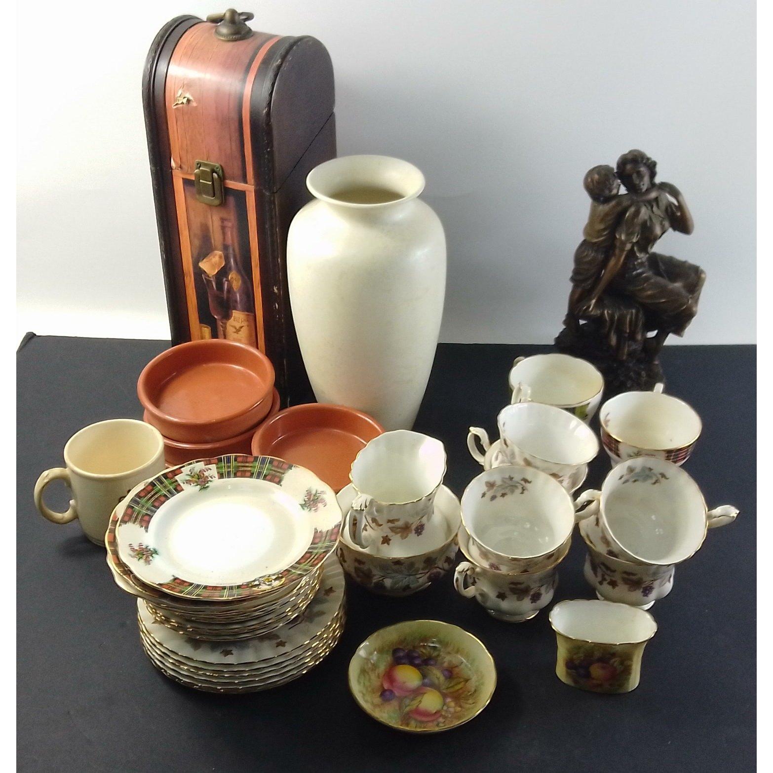 A useful mixed lot comprising part tea sets, including BONNIE SCOTLAND pieces, POOLE vase, ornaments and others.