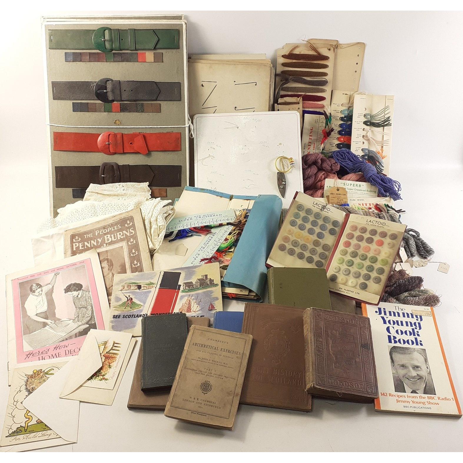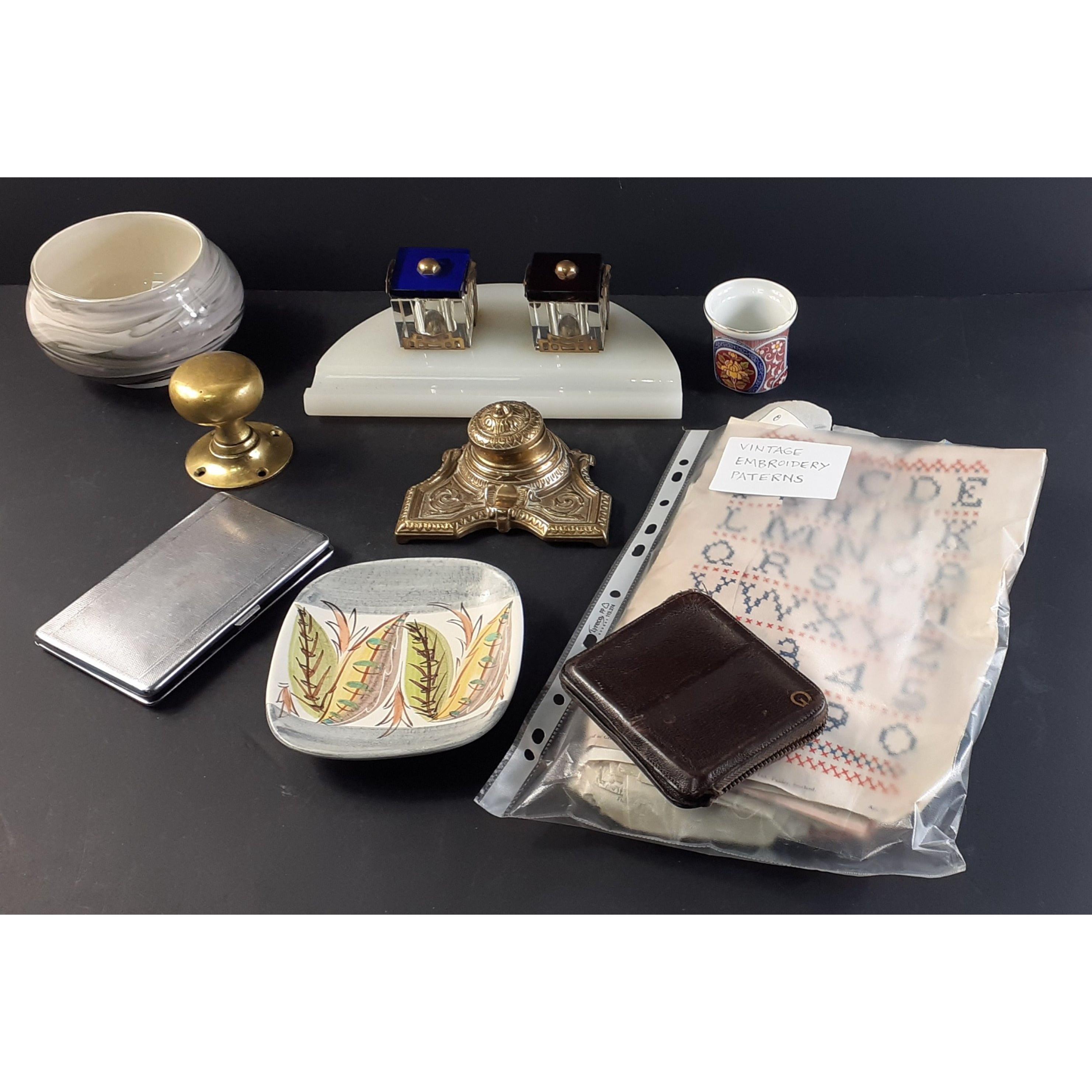 An interesting mixed lot to include Art Deco style desk set with inkwell, a brass inkwell, Hebridean Pottery art vase, brass handle, Japan brush pot, embroidery patterns, a DENBY plate, etc