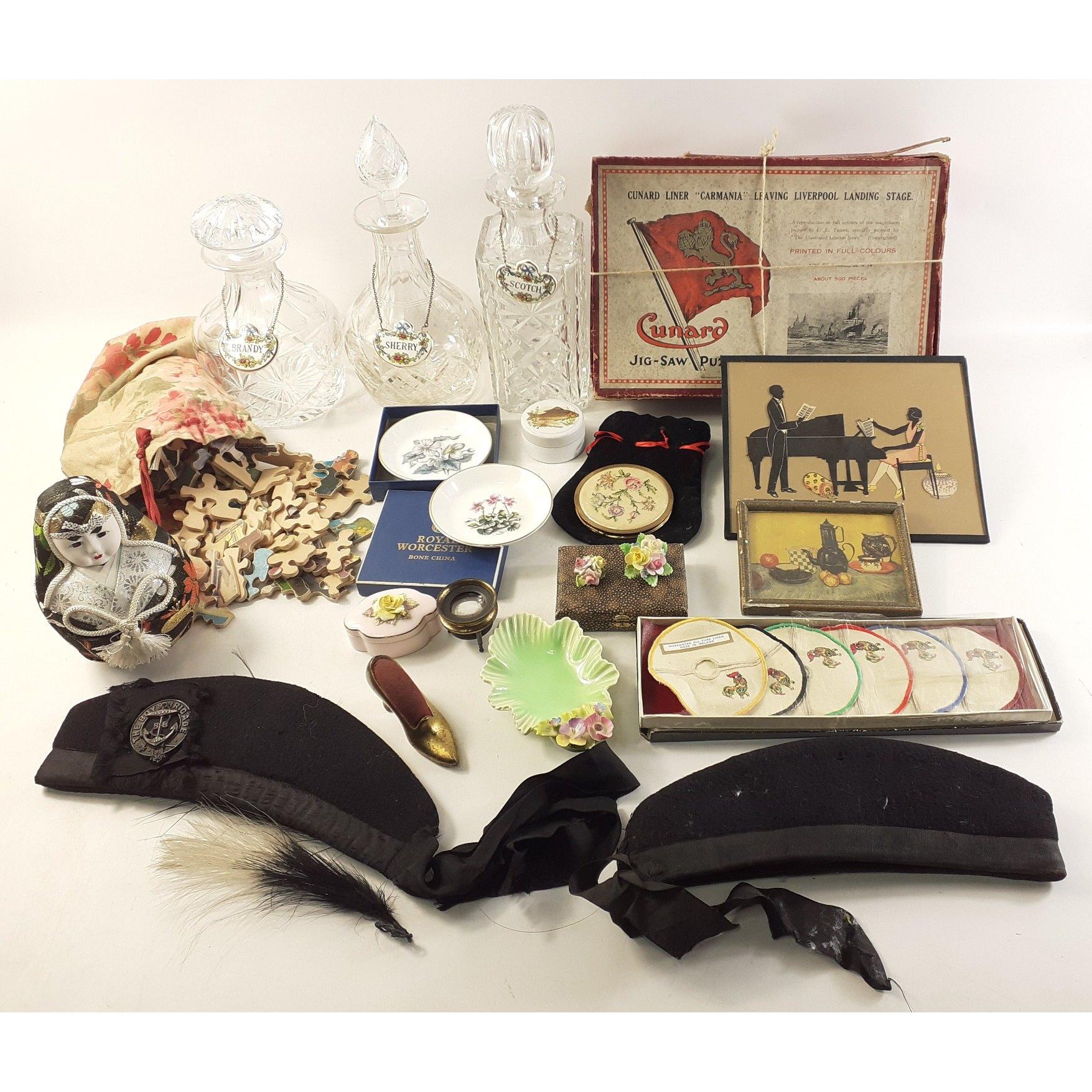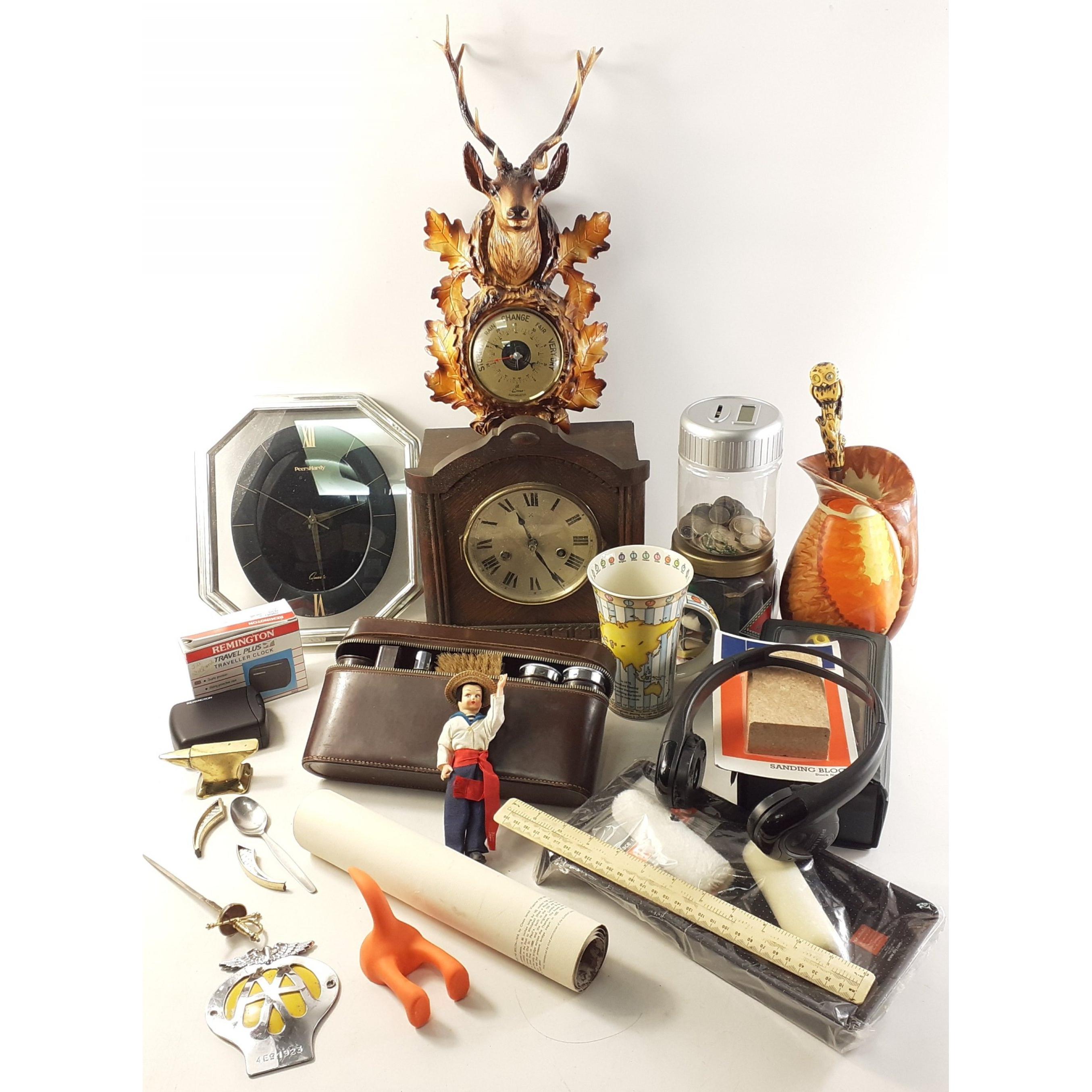 A mixed lot to include a wooden mantle clock, wall clock, plated dressing table set, barometer with stag head top, decorative items, Gretna Green anvil, tub of sewing items etc
