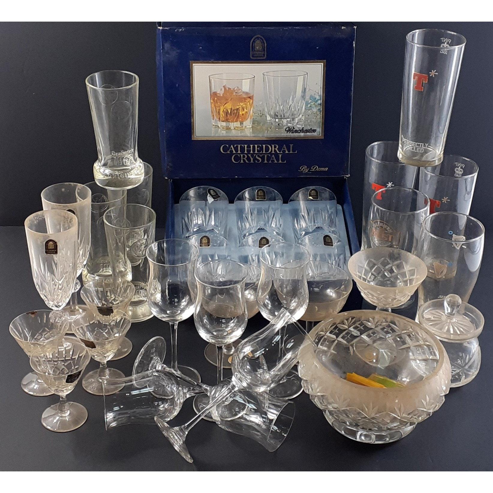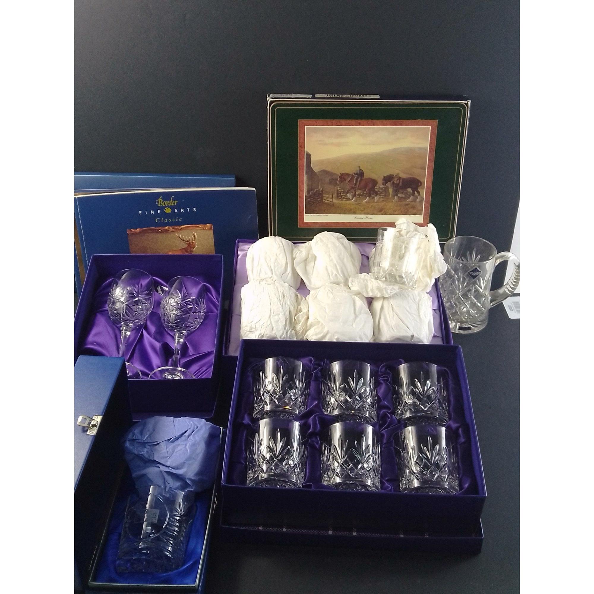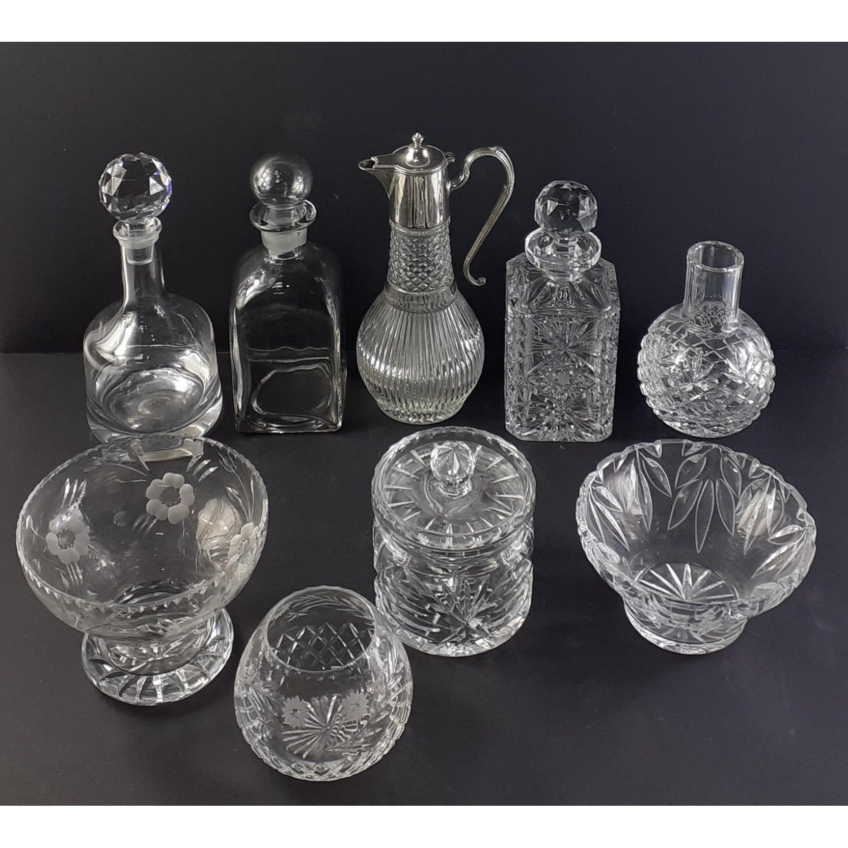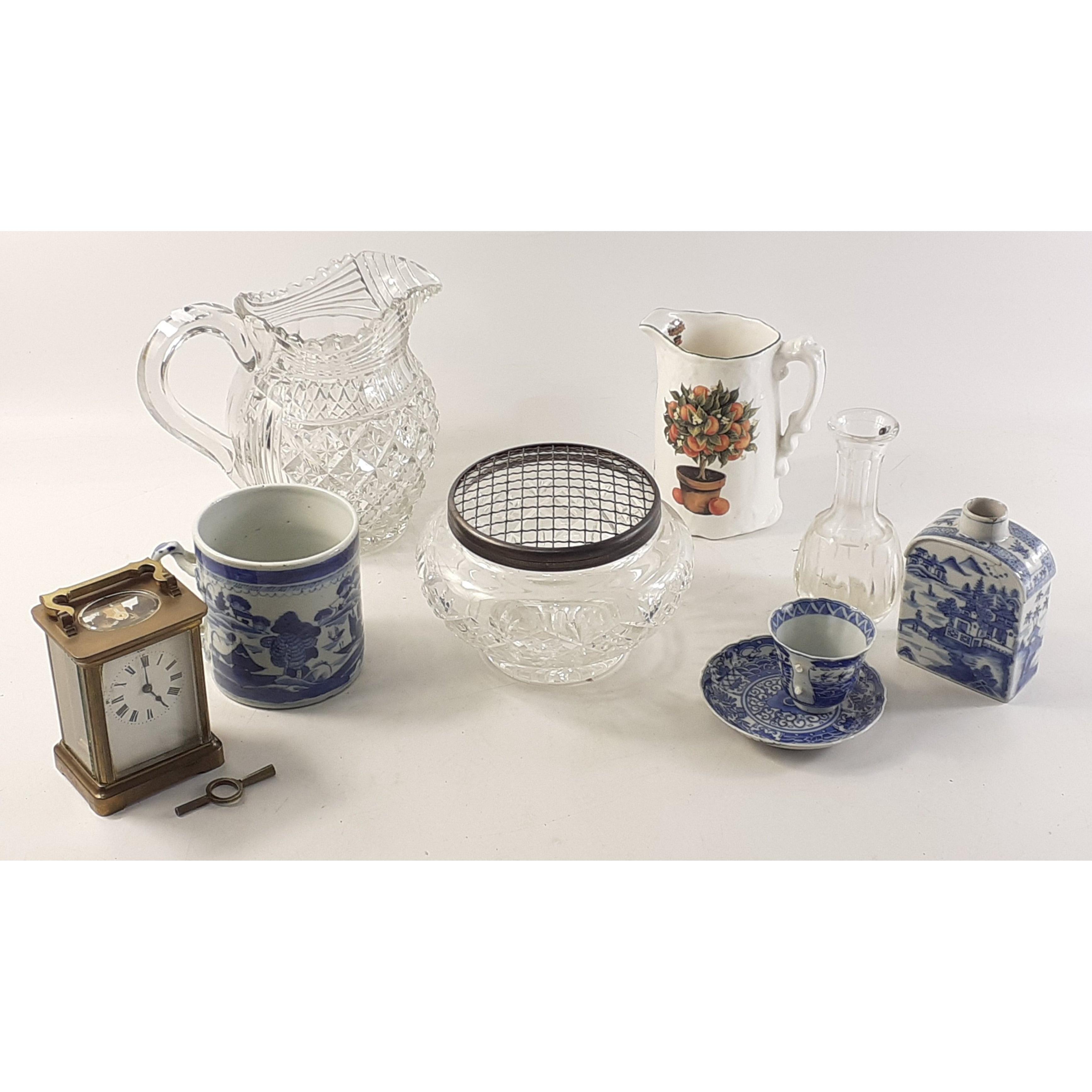 A mixed lot to include crystal jug and rose bowl, brass carriage clock, antique glass 1 gill measure, water jug, blue and white decorative items and others.
