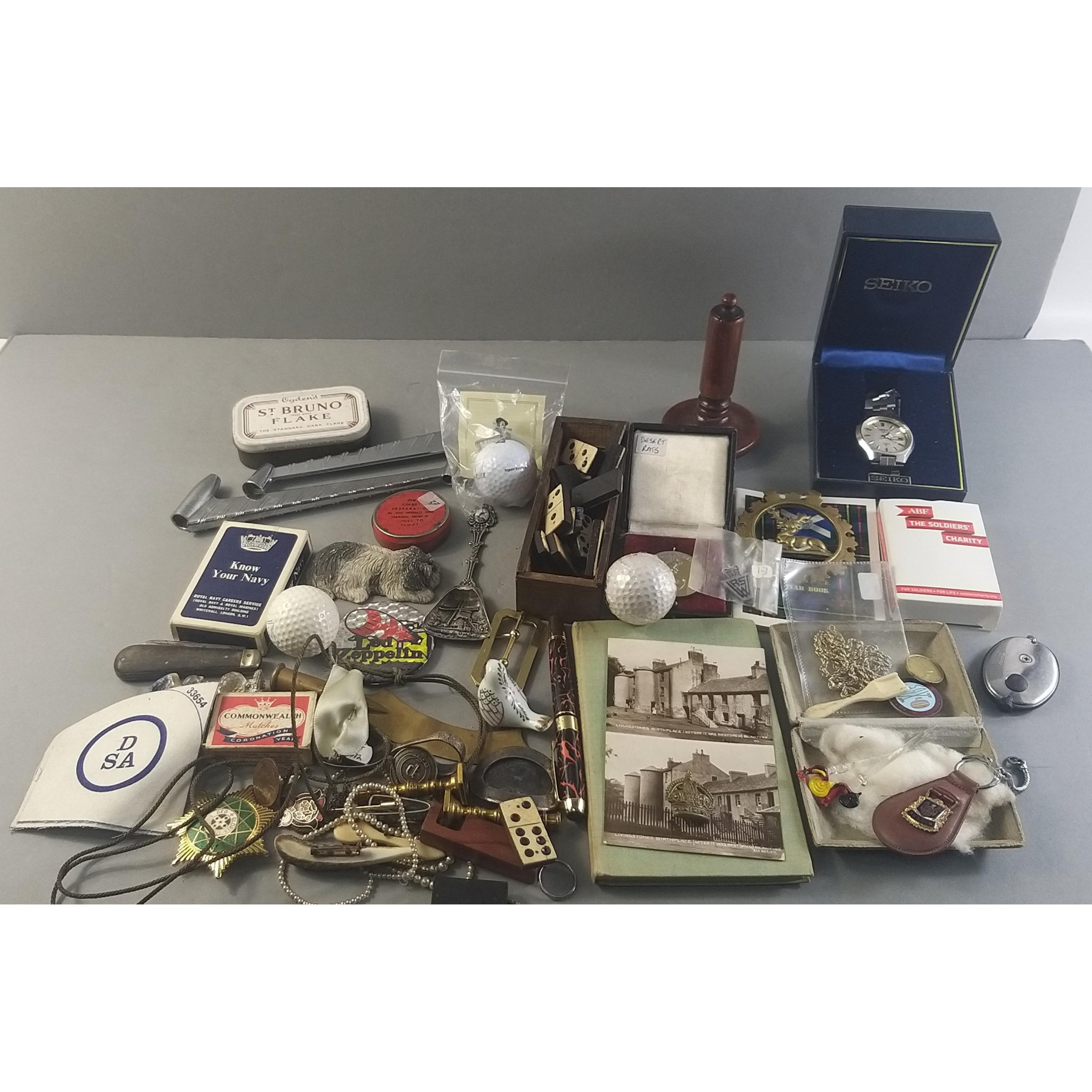 An intriguing wee box filled with BITS 'N BOBS, Seiko watch A/F, badges, buttons, darning mushroom, playing cards etc.