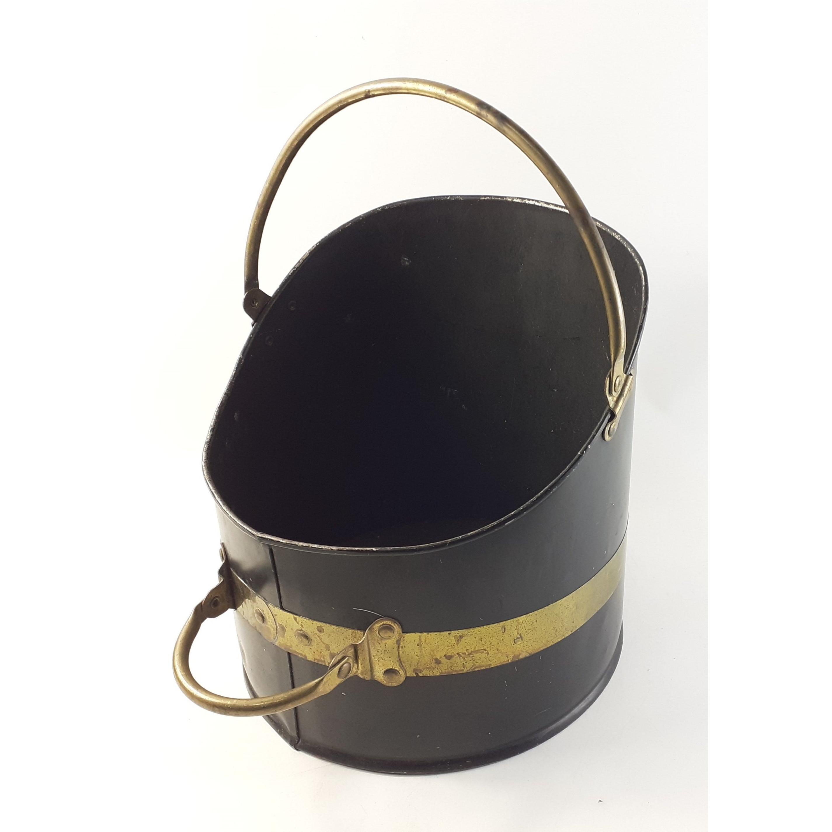 A useful and decorative coal scuttle with brass handles and brass band