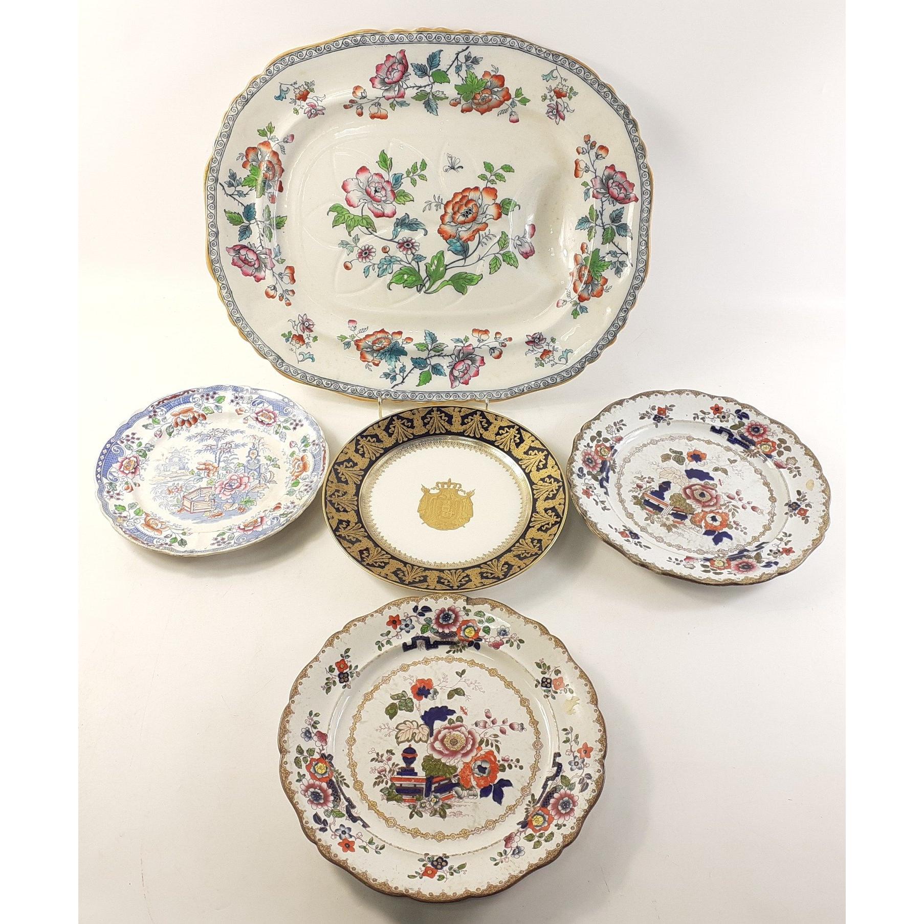 A collection of ceramic plates to include large Ashworth Rose meat plate 47cm approx, Ironstone and others, Five in total