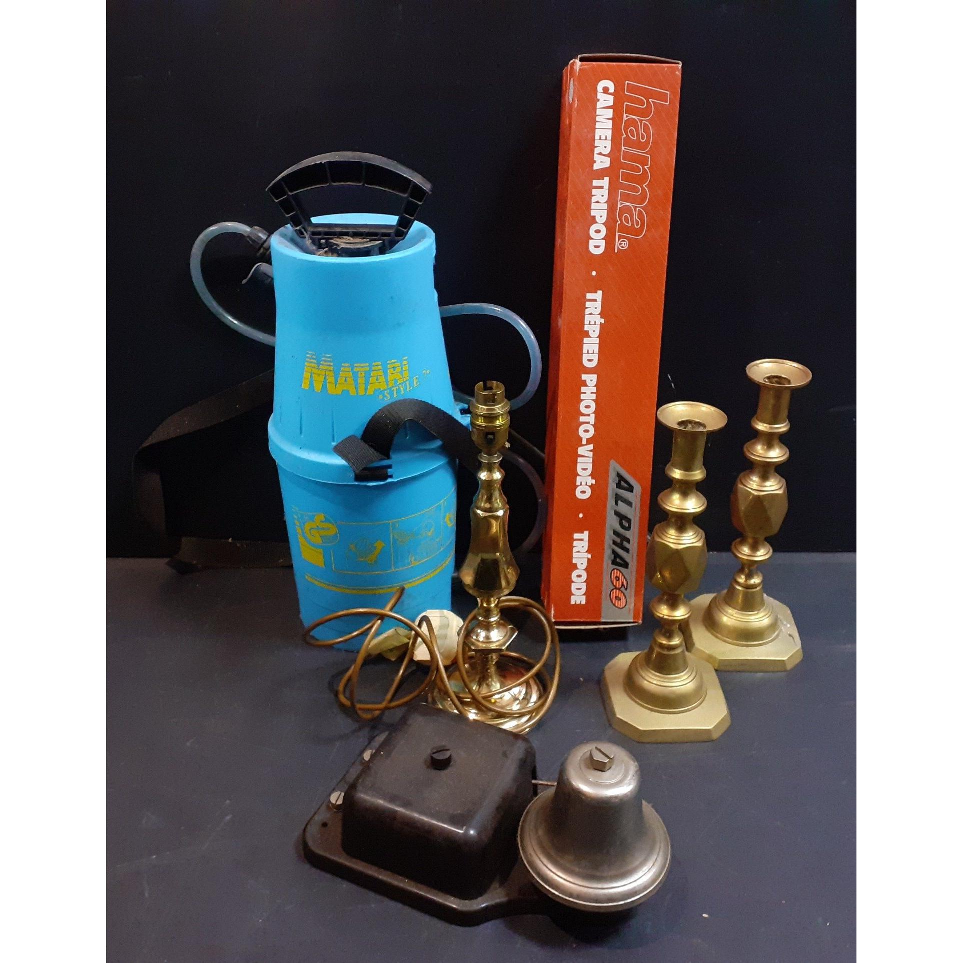 A mixed lot to include garden sprayer, small tripod, doorbell, brass candle stick and others.