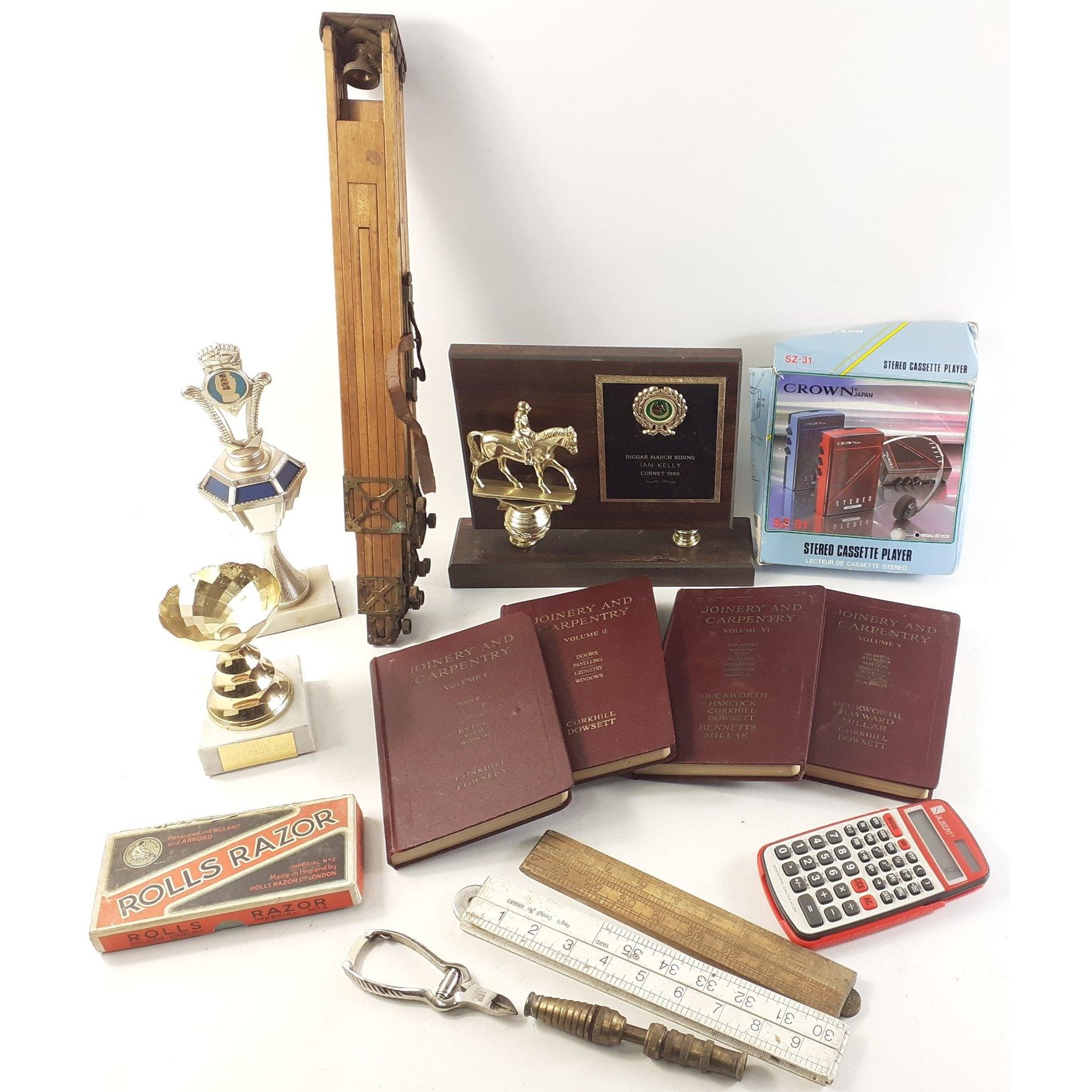 A small collection of items of interest to include calculators, rules, tripod, joinery and carpentry books and others.
