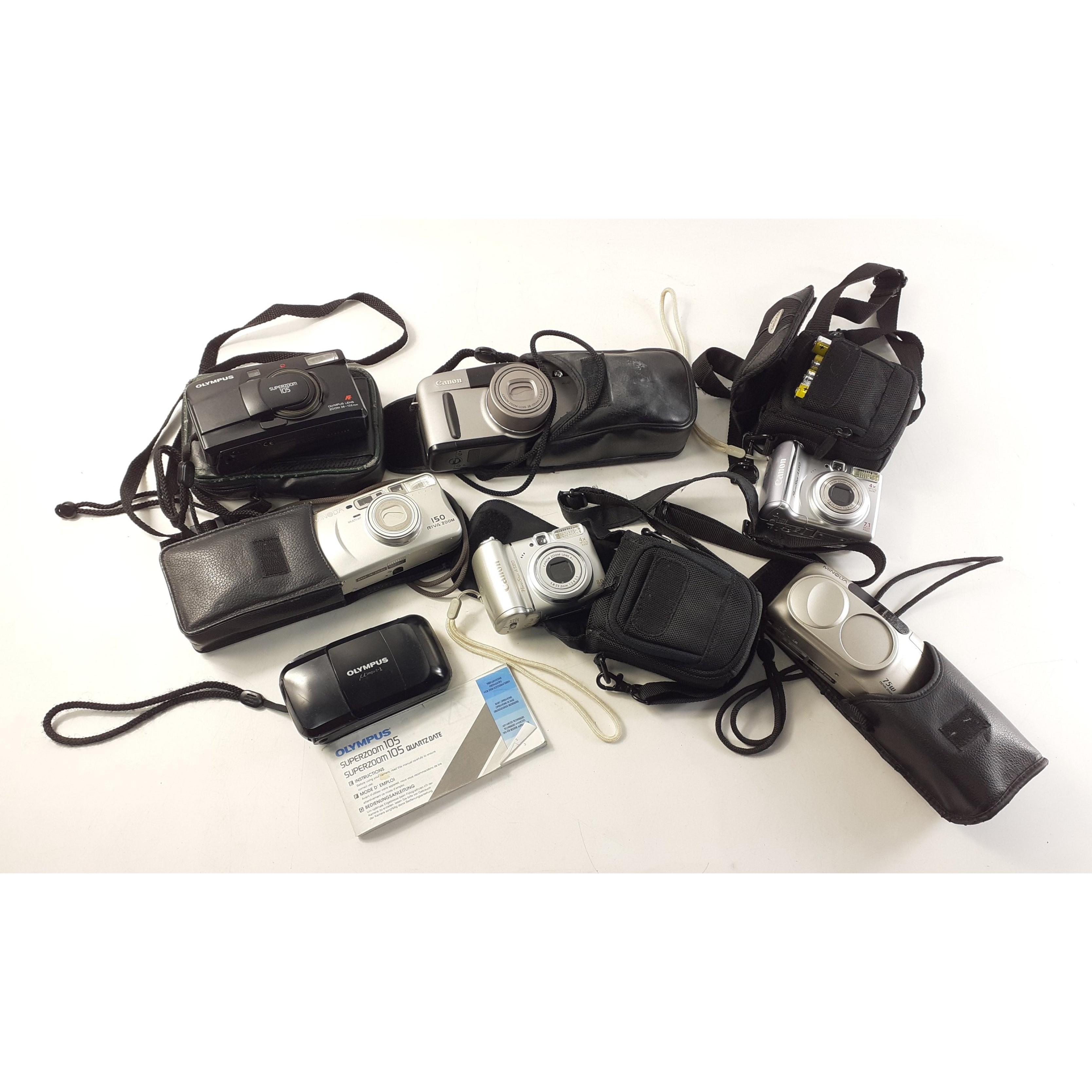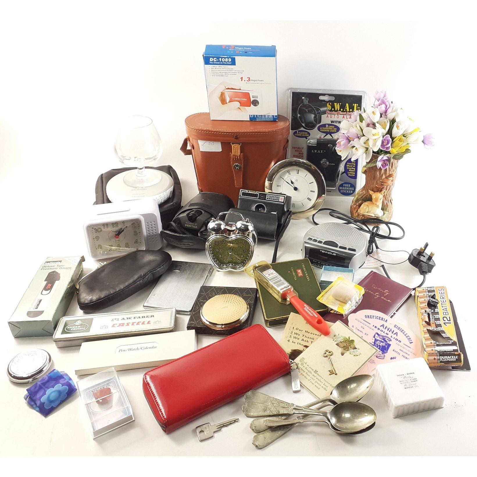 A mixed lot to include kitchen clocks, digital alarm clocks, cameras, decorative items, binoculars, tyre pressure gauge, steering wheel anti-theft device, Sony Walkman, etc