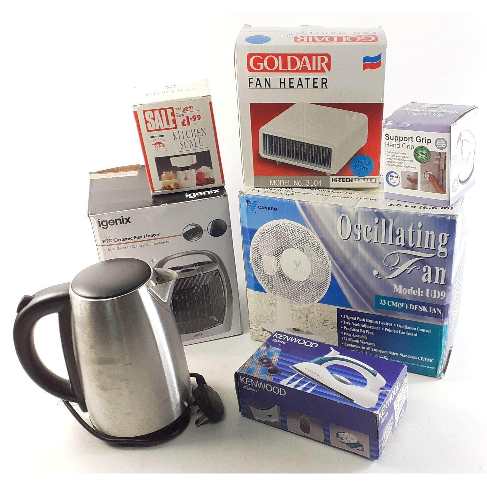 A mixed lot containing an oscillating fan, kitchen scales, KENWOOD portable travel iron, electric fan heater, electric kettle