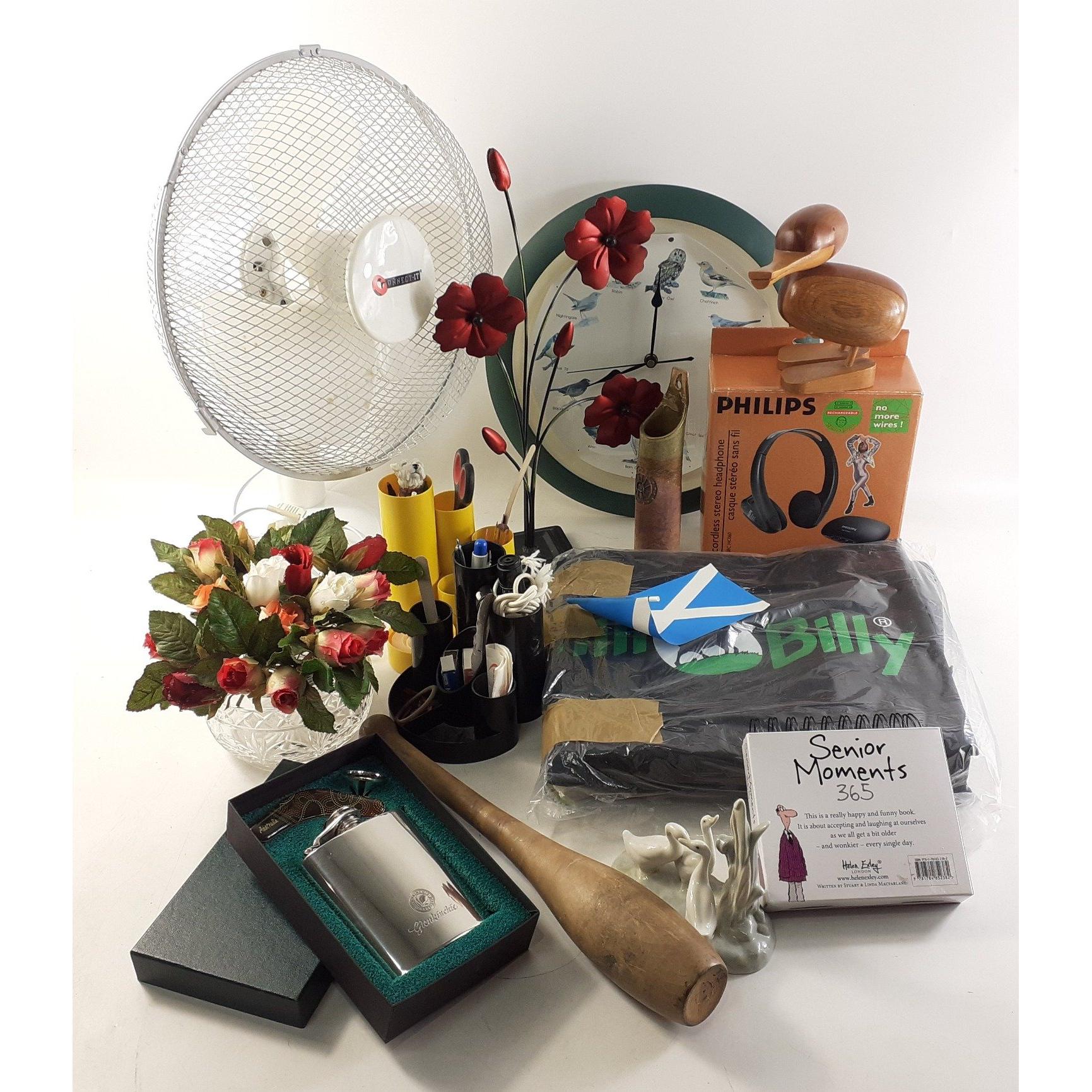 A mixed lot to include an oscillating fan, 2 desk tidies, hip flask, bird clock, cordless head phones, etc