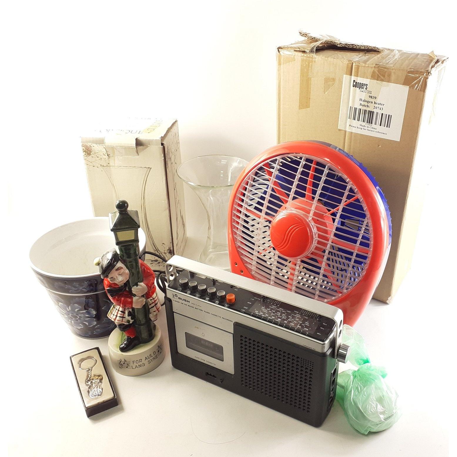A useful mixed lot to include a halogen heater, a colourful plastic fan, a VINTAGE BUSH radio cassette with cable, a musical decanter (not working), a pottery plant pot and 2 vases