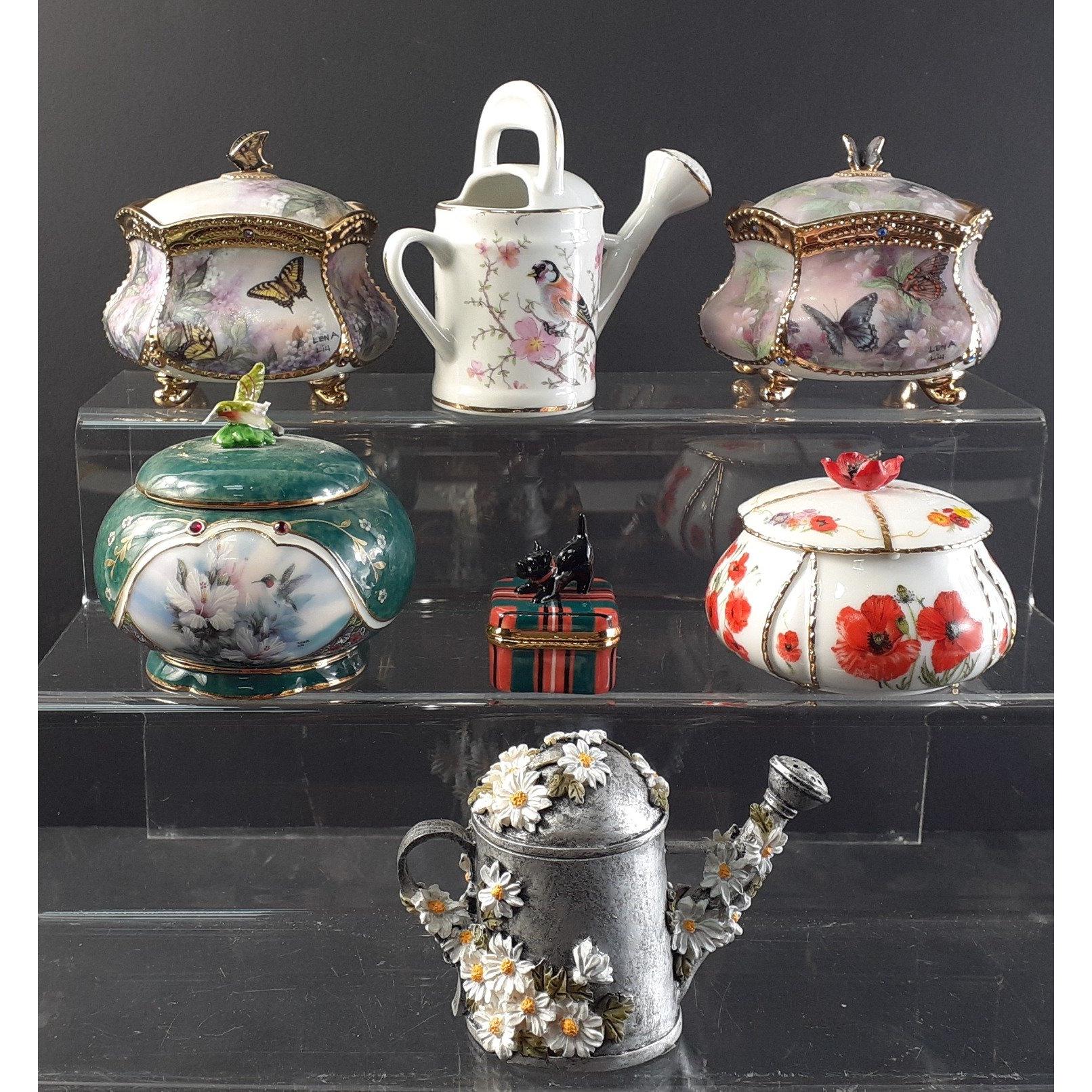 A mixed china box to include 3 piece BUCHAN ware condiment set, raindrop shaped paperweight, HOLLOHAZA black and white trinket box, LIMOGES trinket box with 2 enamelled brooches, part Hungarian tea service