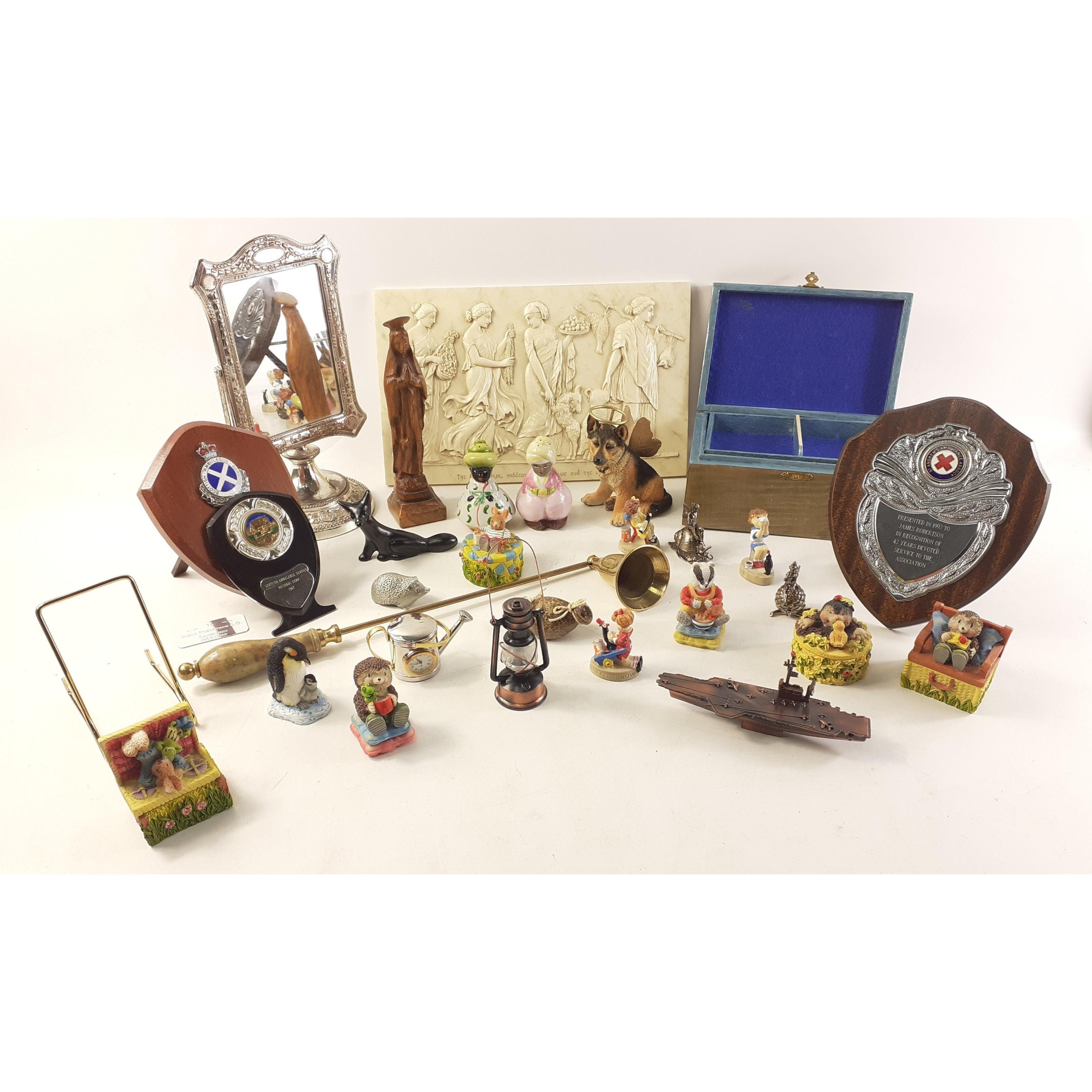 A small mixed lot to include a SELANGOR pewter hedgehog, a dressing table mirror, 24cm high, a carved olive wood statuette of Mary, candle snuffer, 3 presentation plaques, pencil sharpener aircraft carrier, pencil sharpener, oil lamp, 2 metal fairies on snails, modelling can quartz clock, pottery haggis, angelic alastian, 2 tier wooden jewellery box with marquetry eagle design with one loose hinge (18x12x8cm approx).