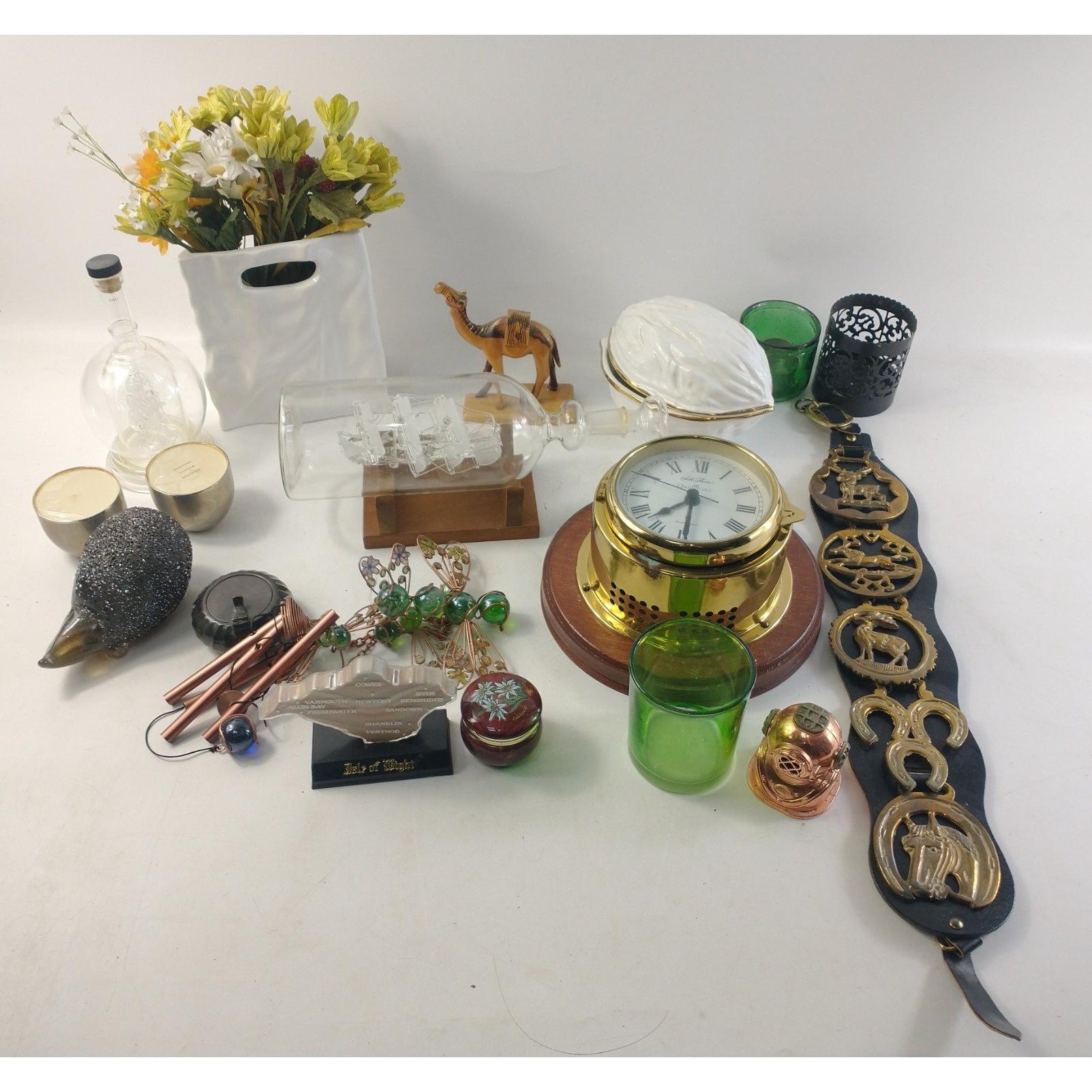 A mixed box to include 2 ships in a bottle, quartz porthole clock, various decorative items, vintage brasses etc