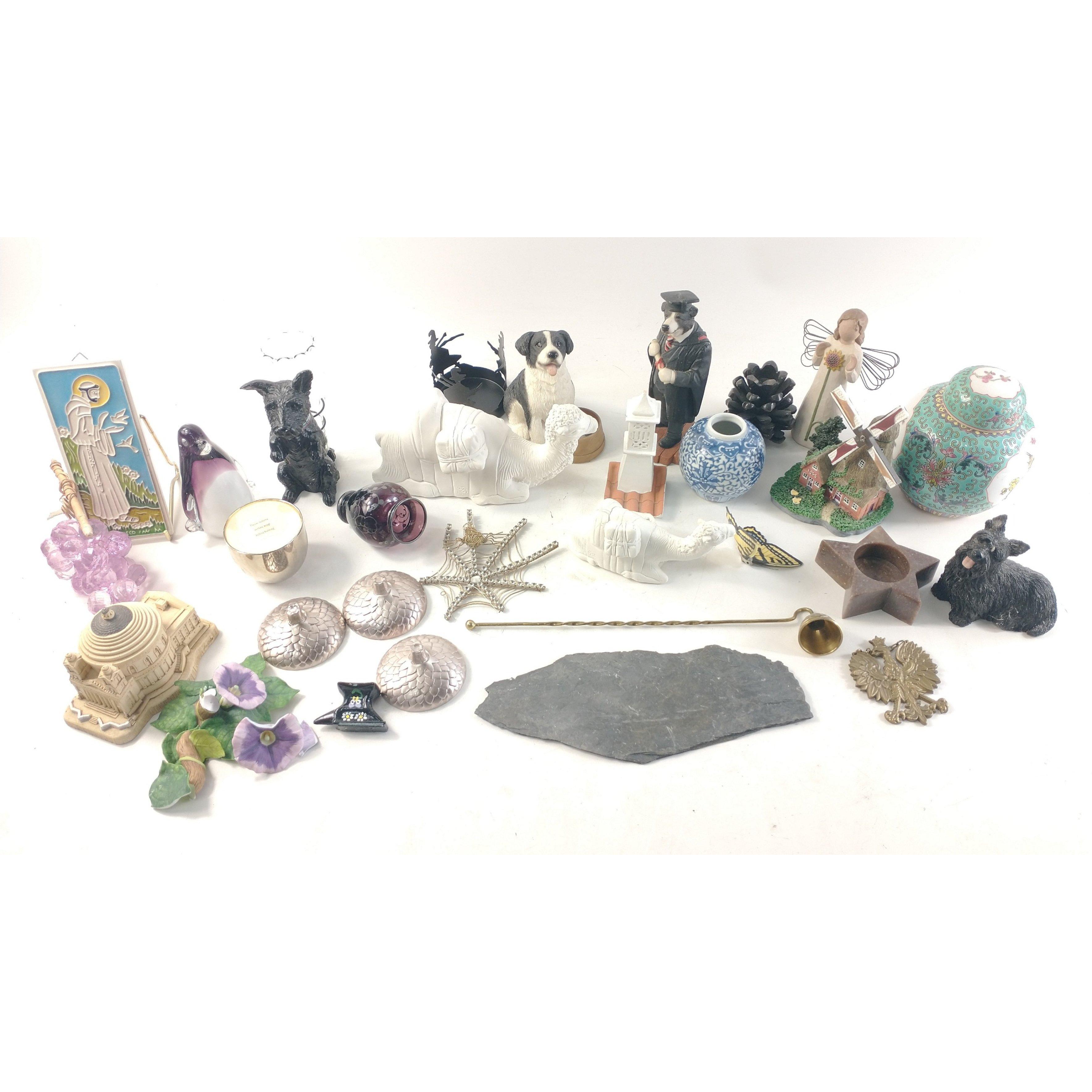 A mixed box to include candles, decorative ceramics, glass penguin paperweight