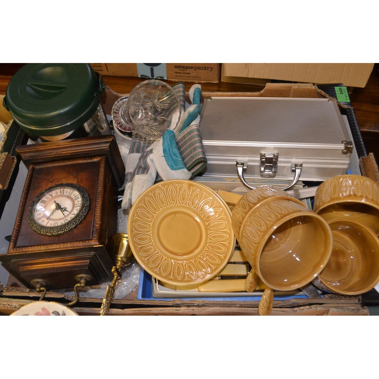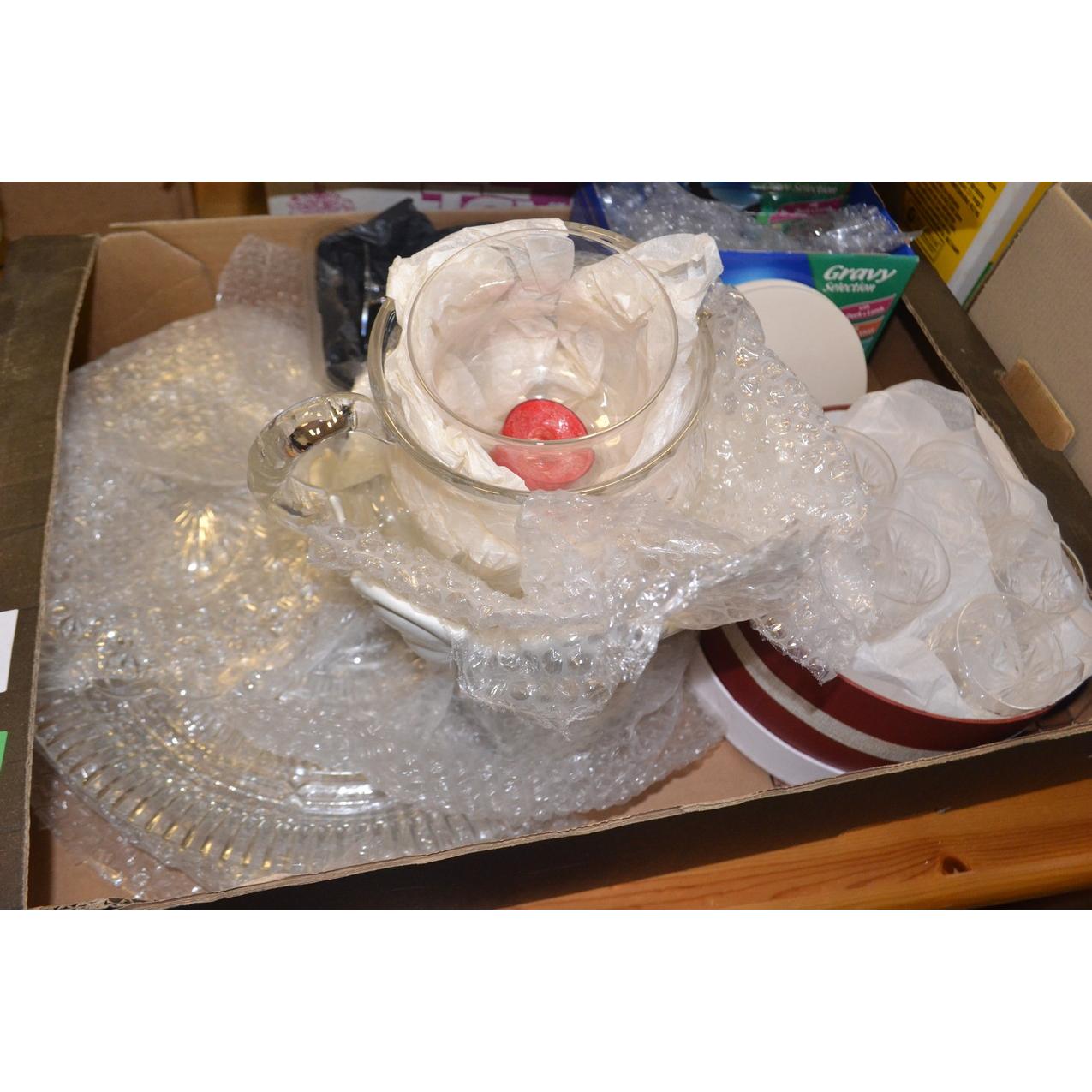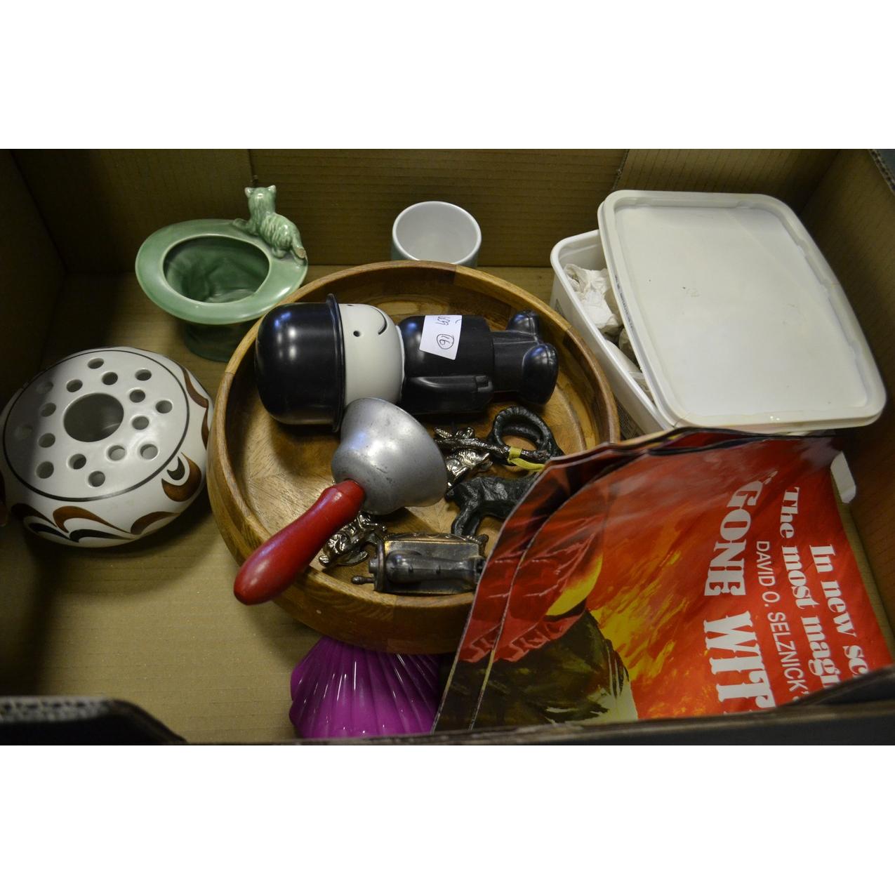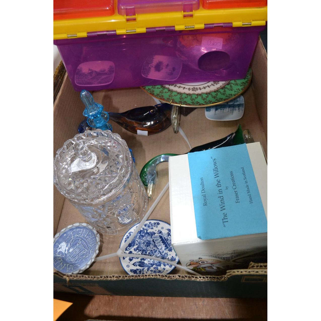 Mixed box to include wren bird ornament, and a large pressed glass vintage plate etc