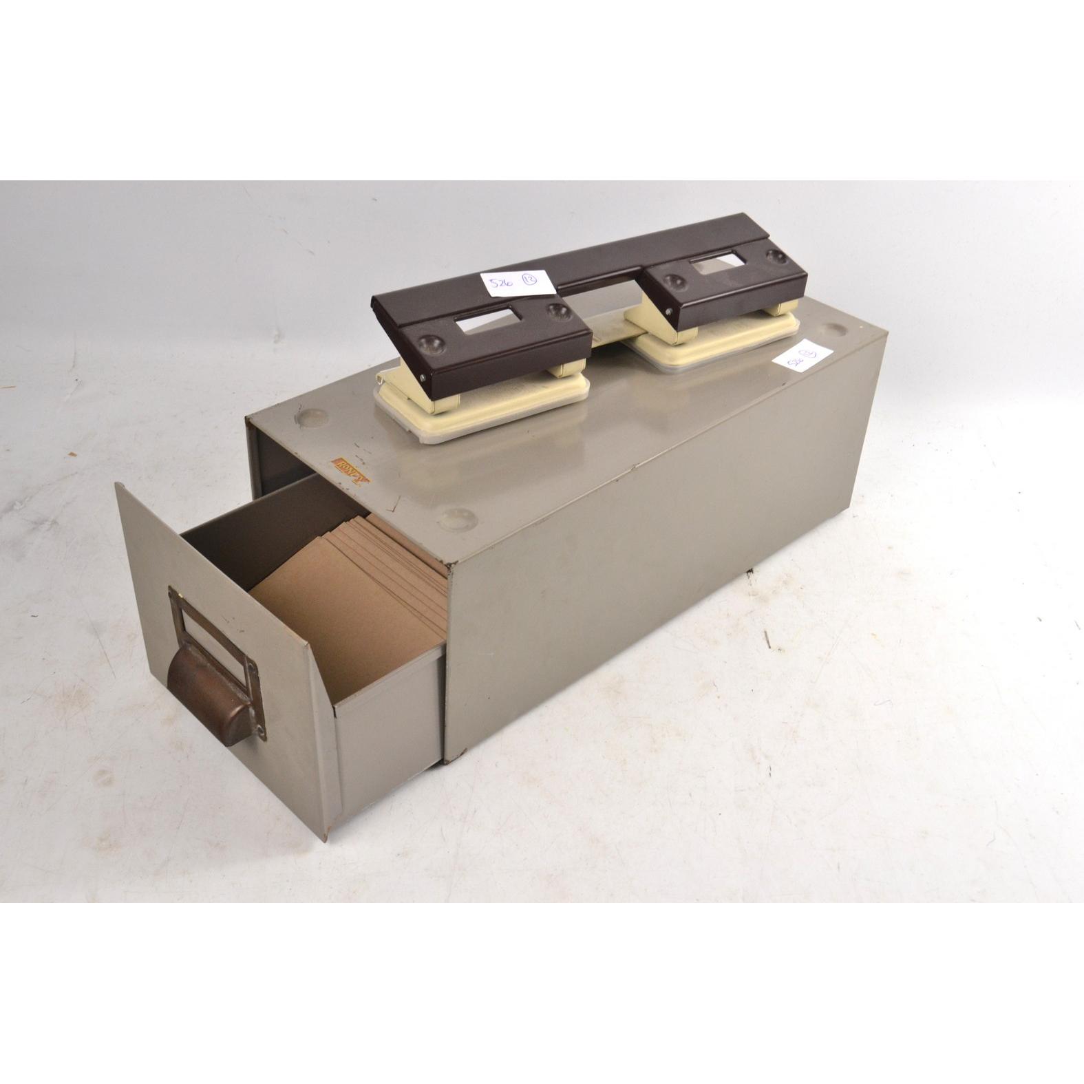 An old single filing drawer with original index cards W17cm x L37cm and a double punch