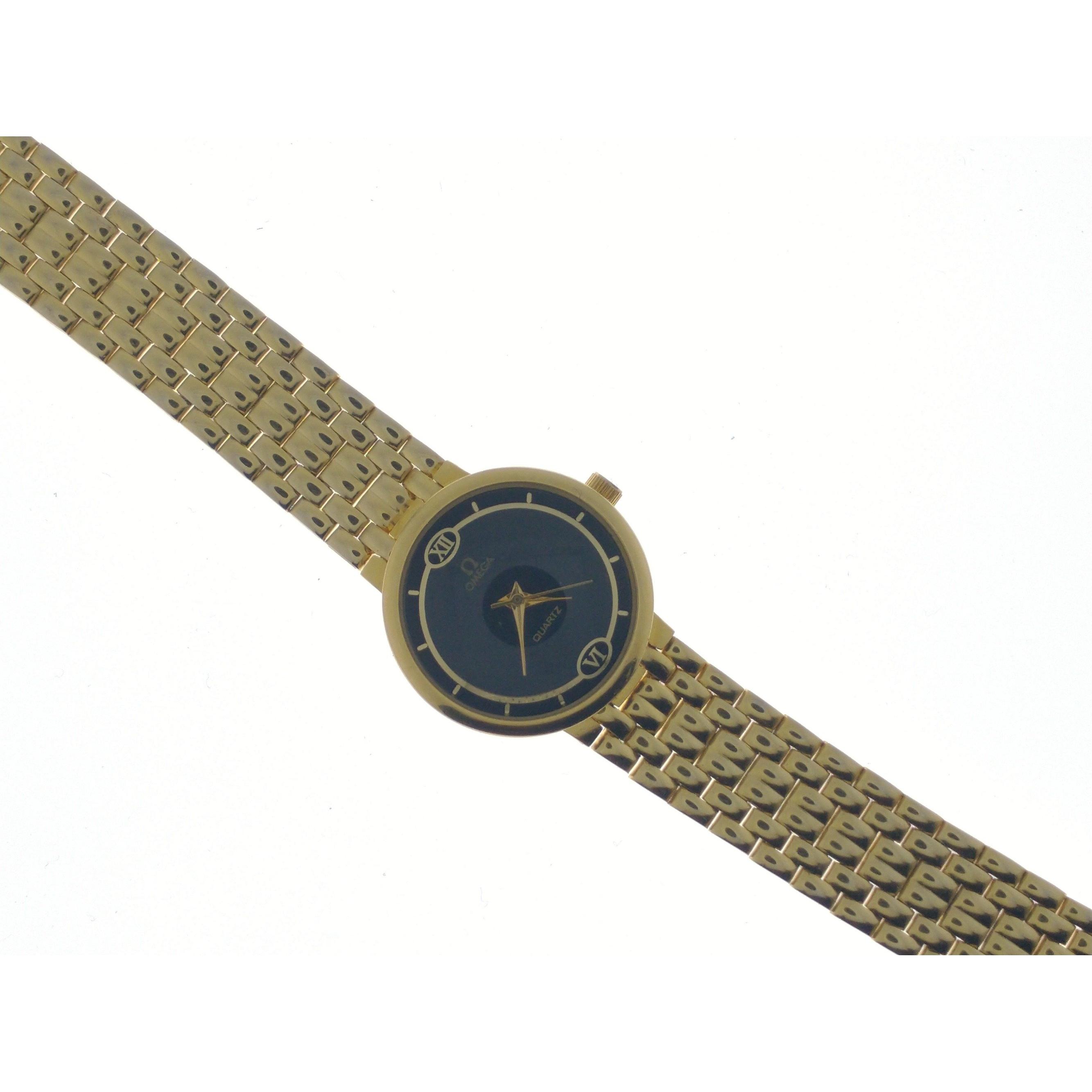 An OMEGA STYLE ladies wrist watch stamped '18k electro plated Japan' with a stamped stainless steel bracelet with a Swiss made movement and battery.
