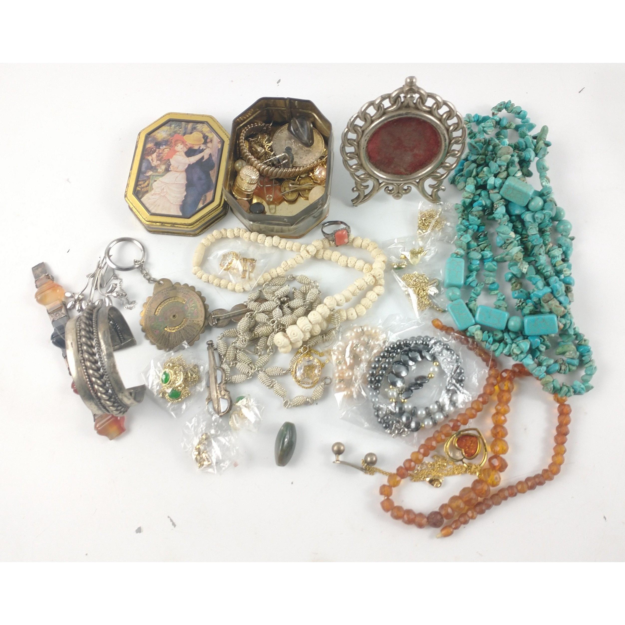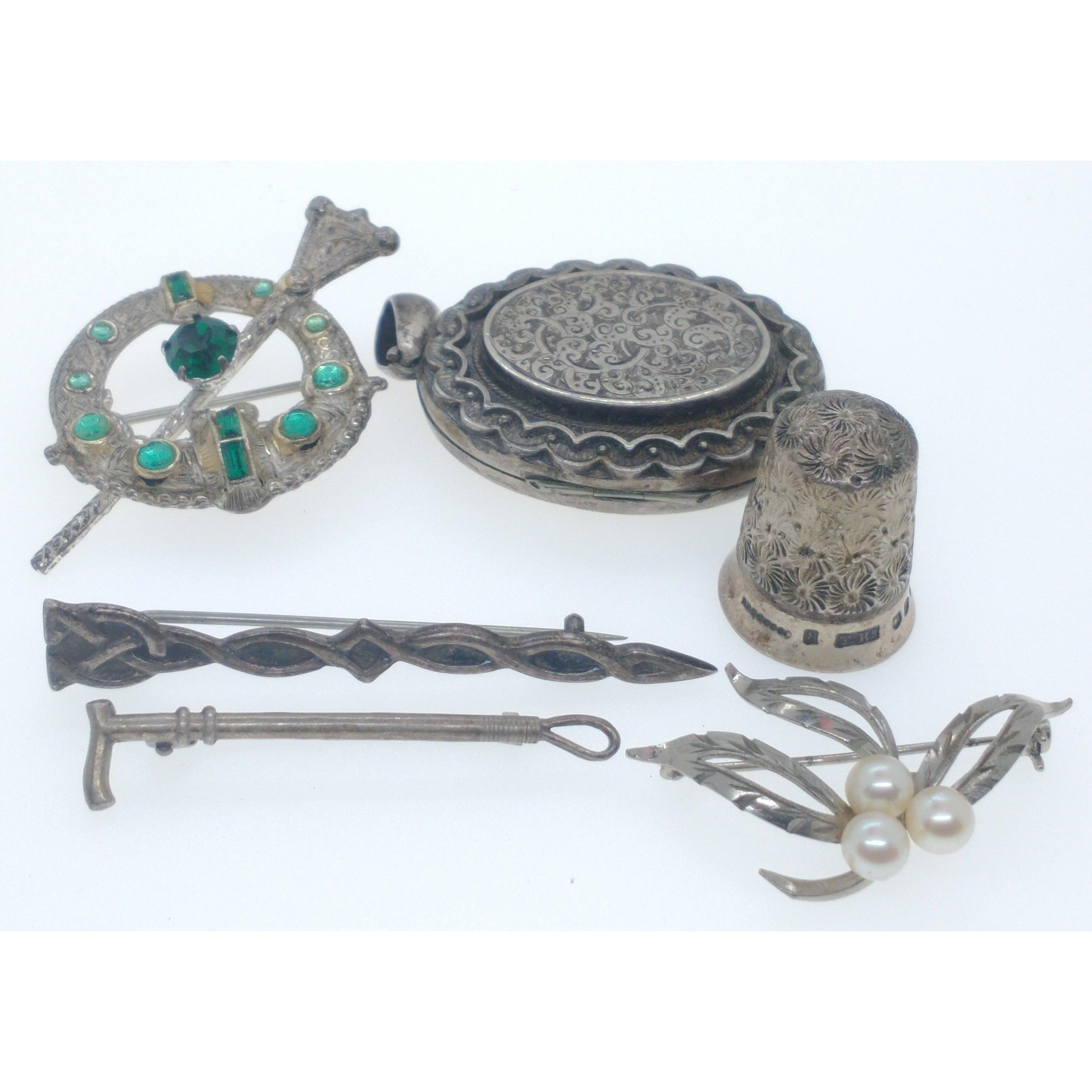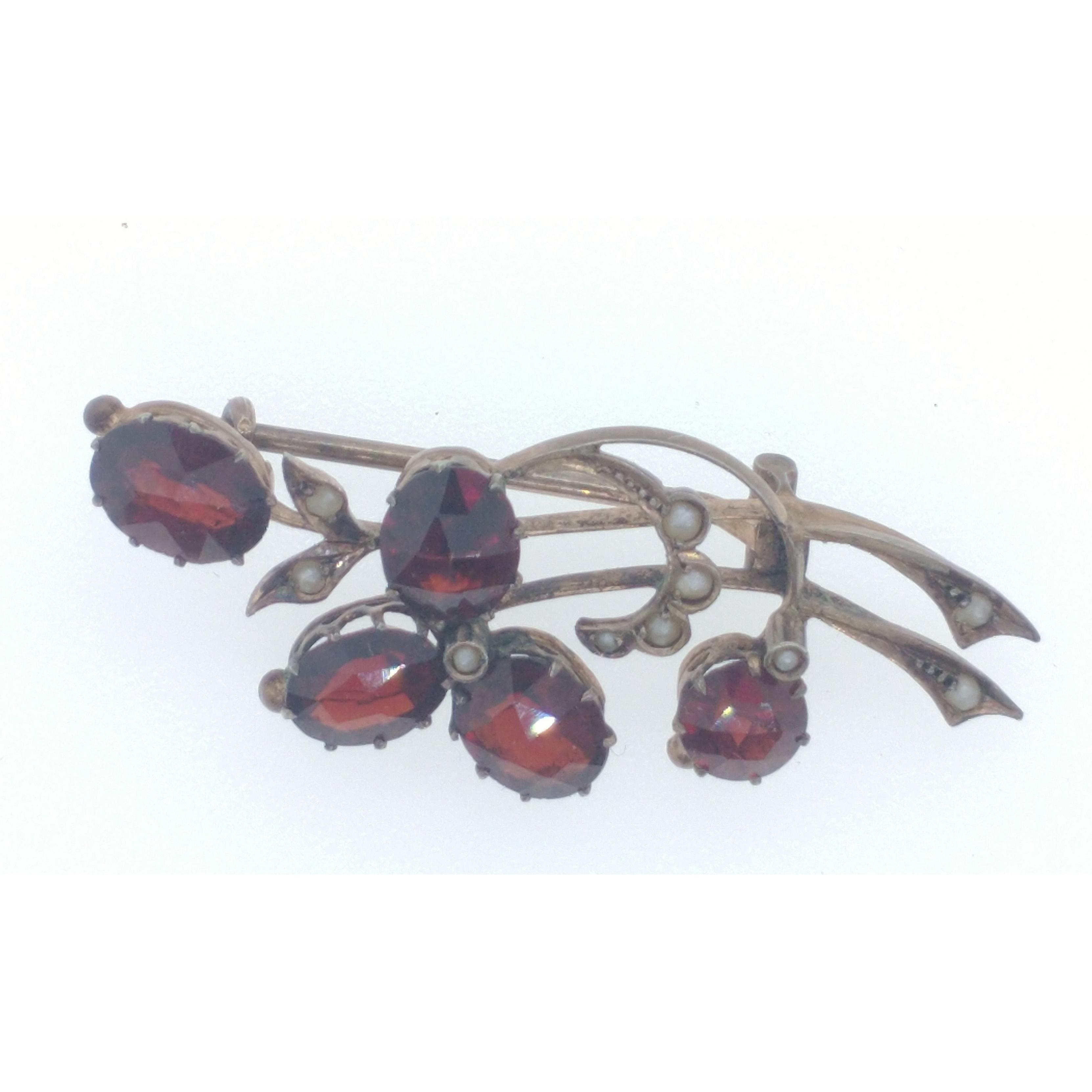 Small 800 stamped floral design brooch, set with red stones and seed pearls.
