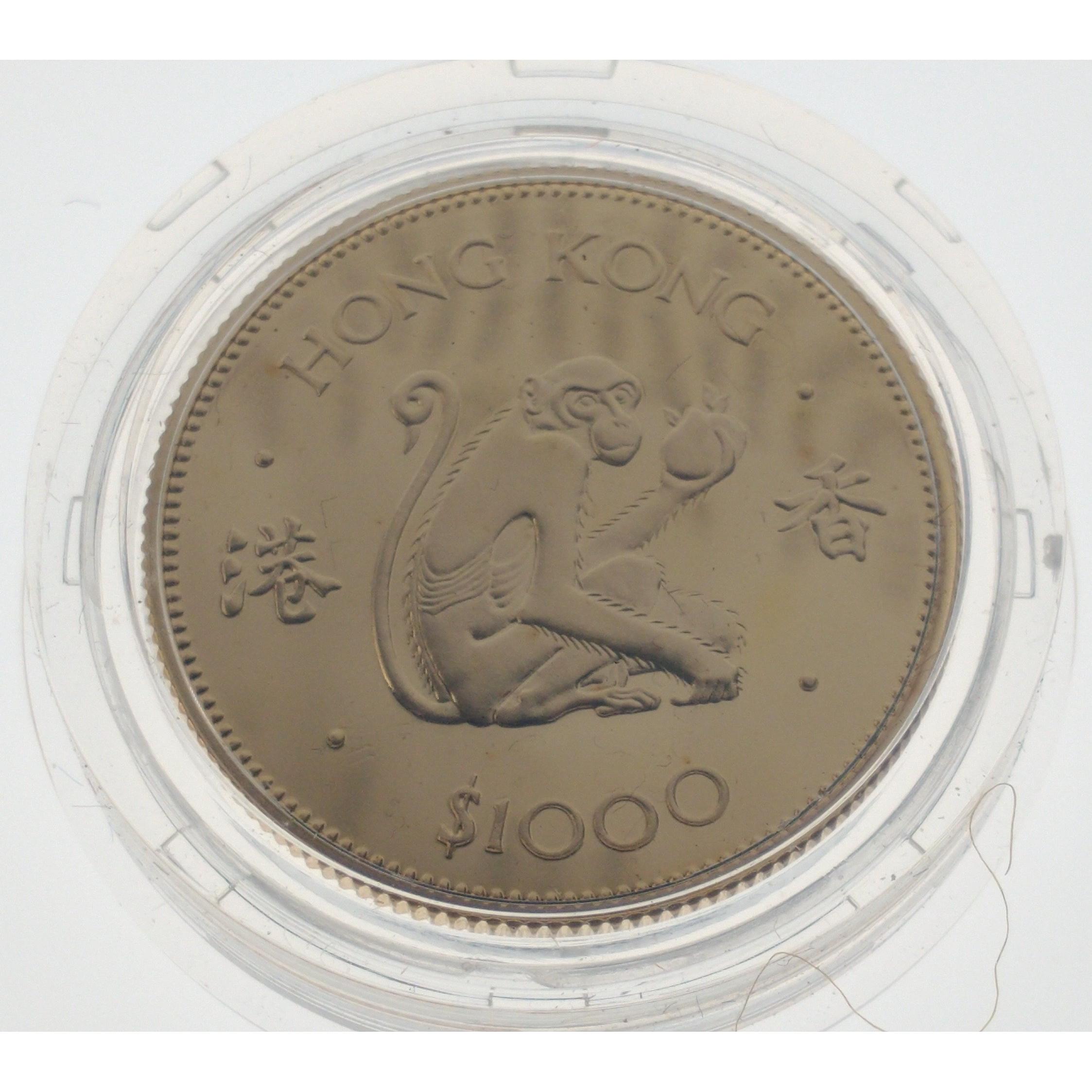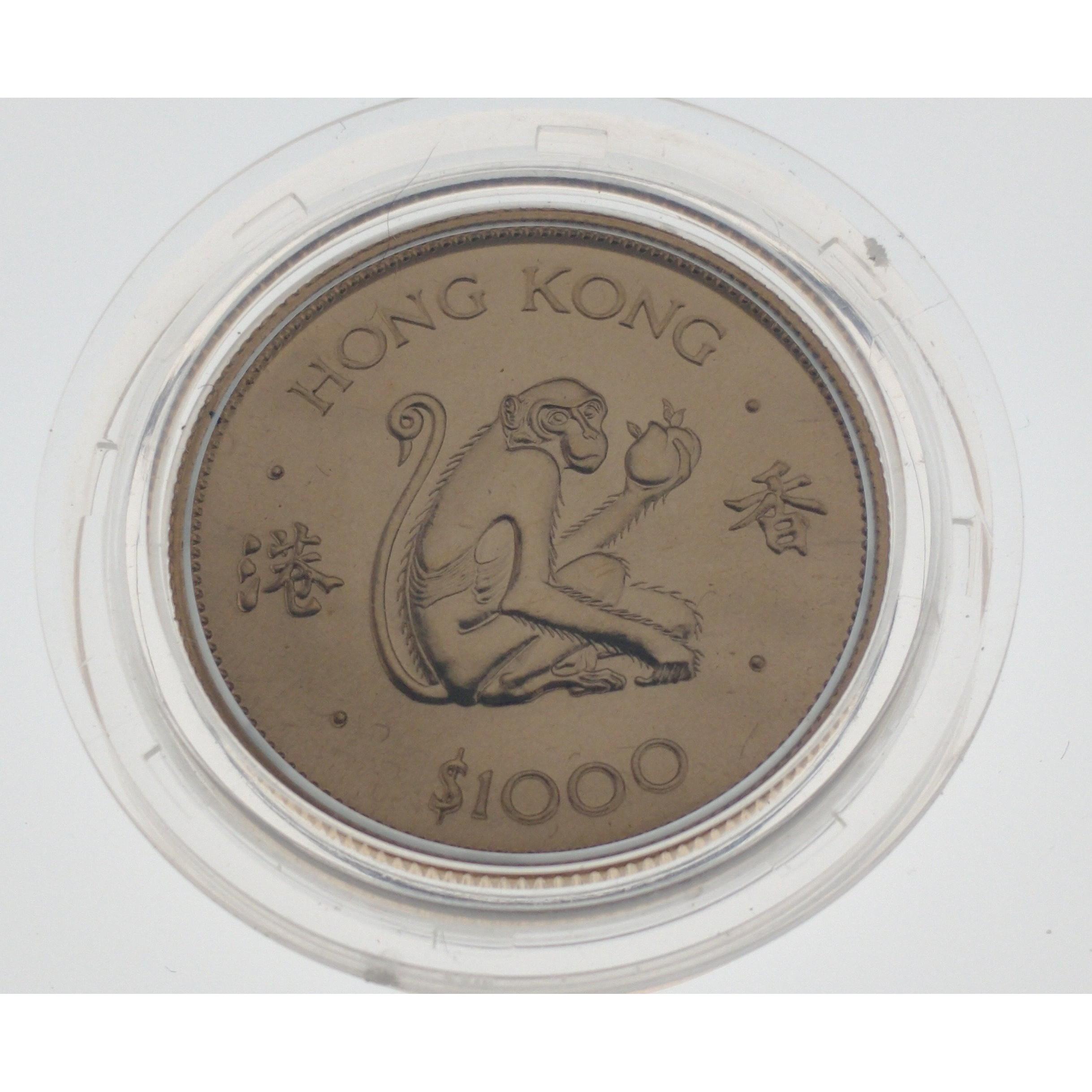 A 1980 HONG KONG $1000 Lunar Year Coin 'The Year Of The Monkey' struck in 22ct yellow gold within its protective case In 1980 to celebrate the Lunar Year of the Monkey, the Royal Mint released a very Limited Issue Lunar Monkey $1000 One Thousand Dollar Gold Proof ...weight 15.96g - comes in original presentation case and protective covering