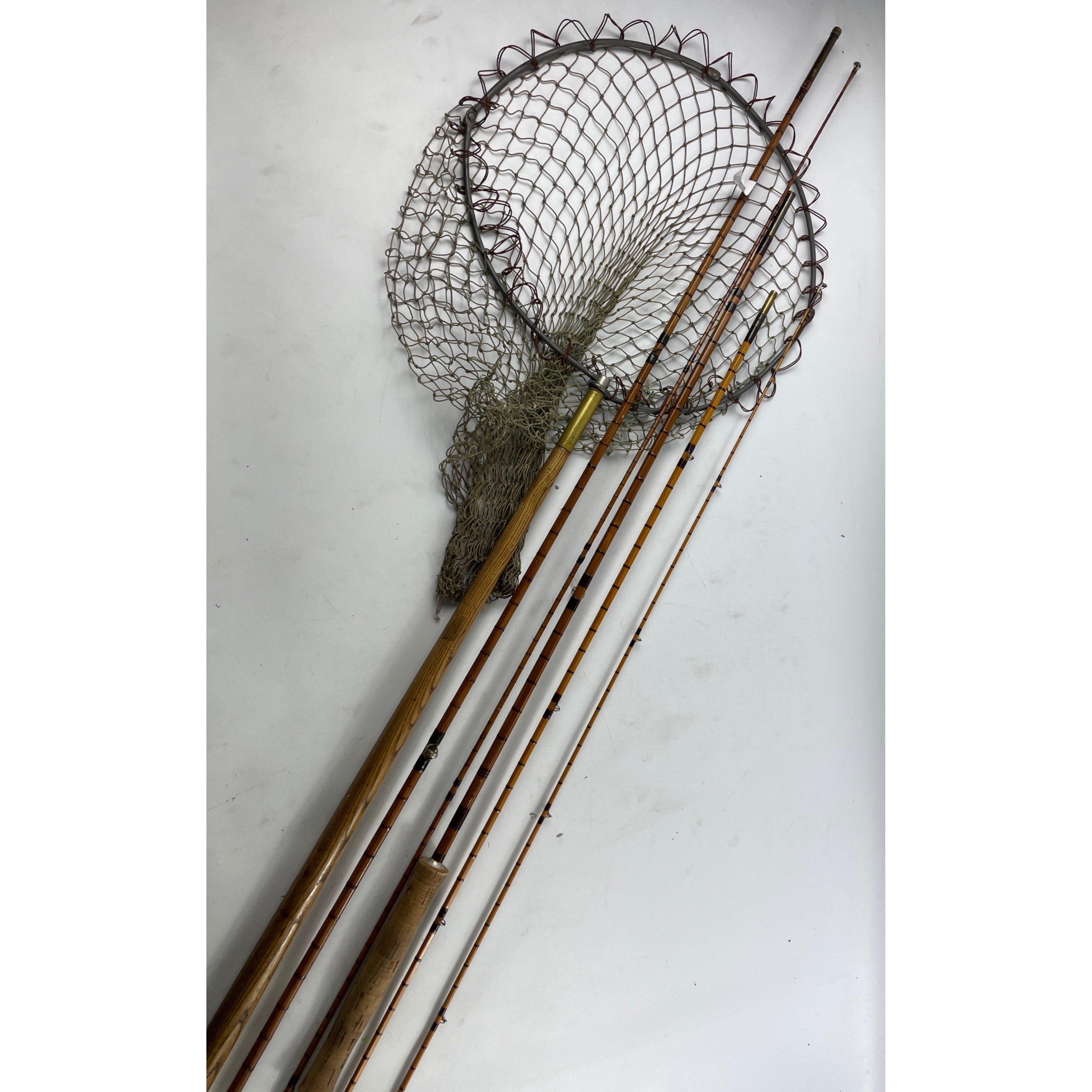 A 1911 HARDY PALAKONA split cane THE PERFECTION 2 piece 9'8" fly rod, serial number A65318, no bag (re-tipped) and a JS SHARPE of Aberdeen split cane 9 1/2' 3 piece fly rod in original bag plus a catcher's net.