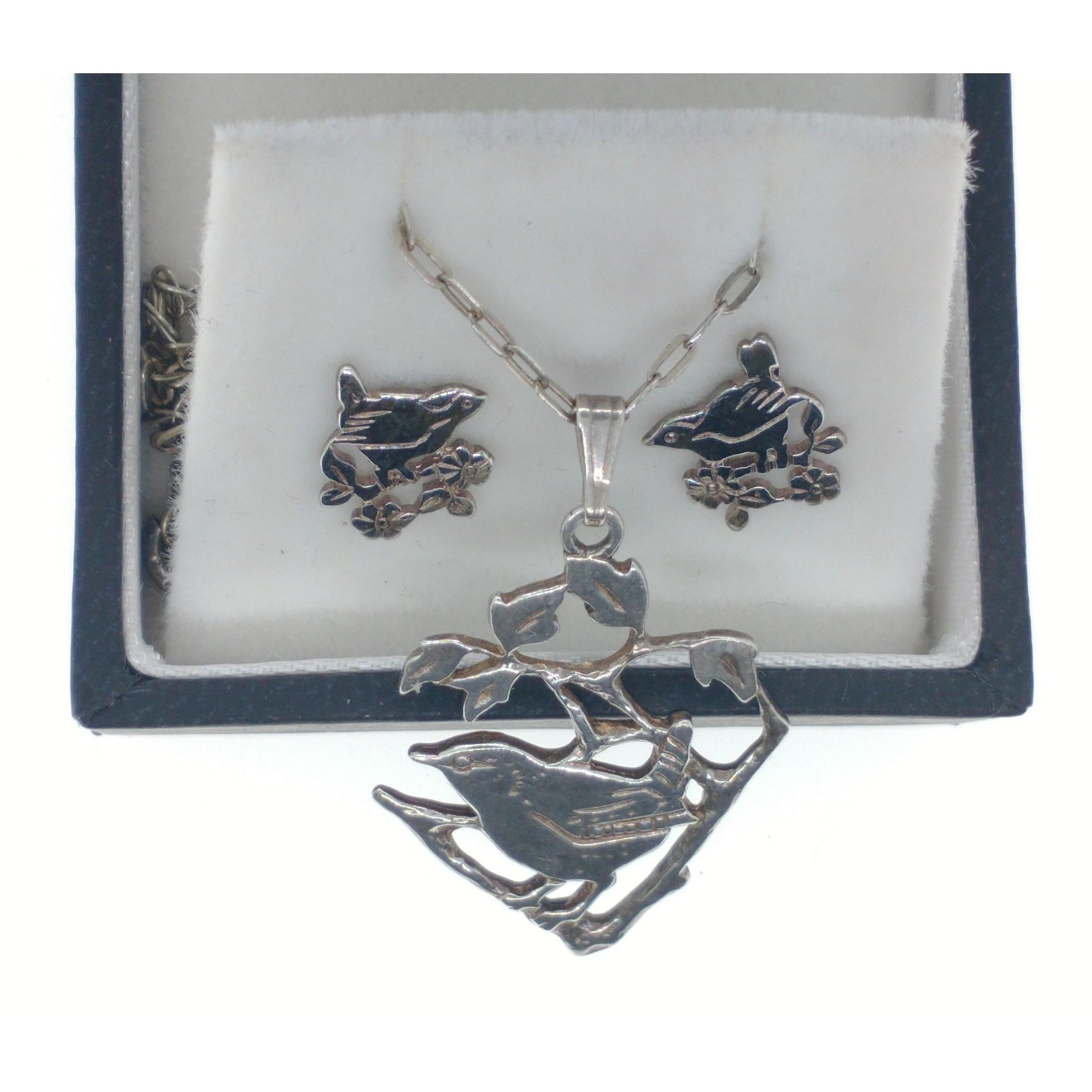 925 Stamped silver pendant and chain and matching earrings depicting small bird on branch [? Wren ]