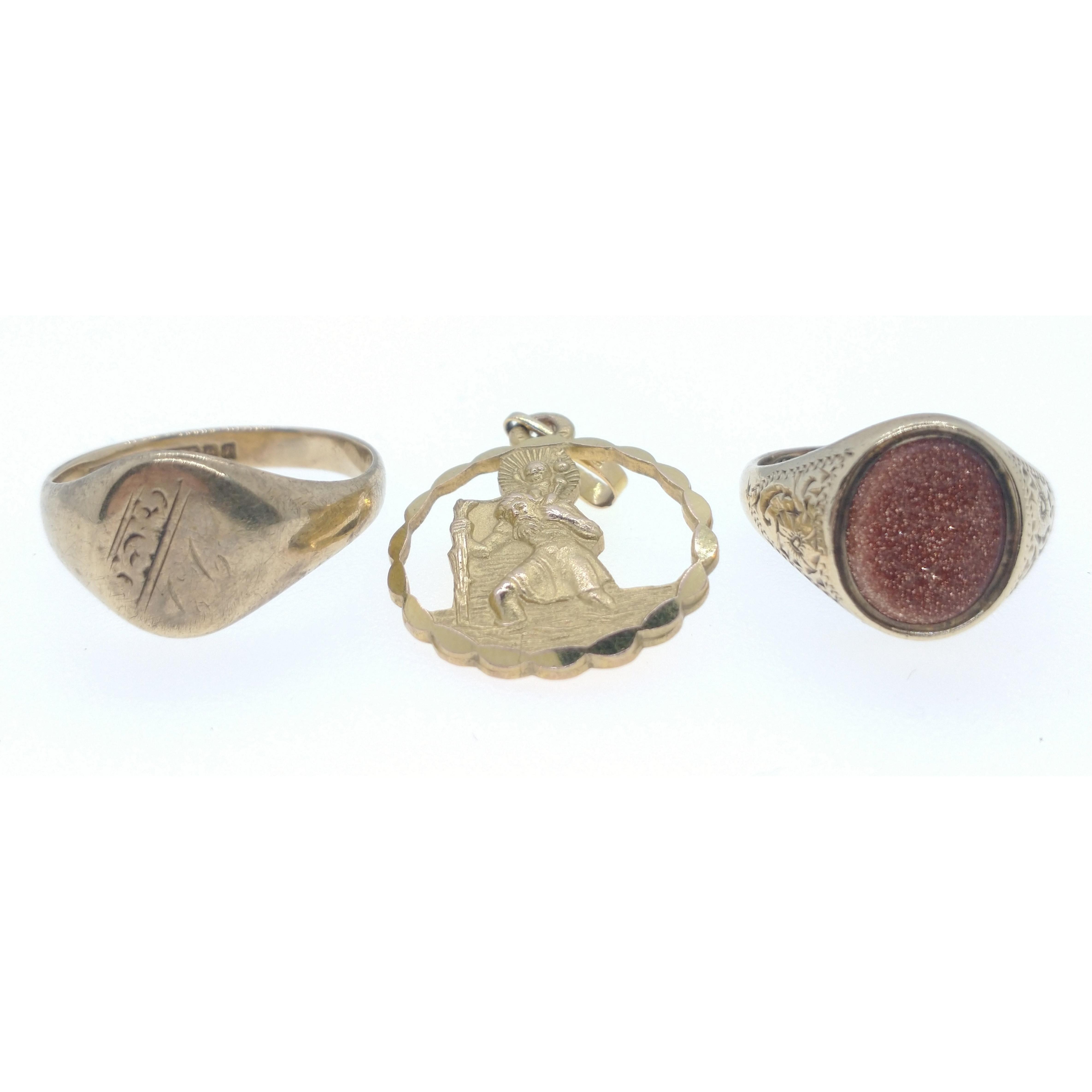 Two 9ct hallmarked signet rings and a 375 hallmarked St Christopher pendant