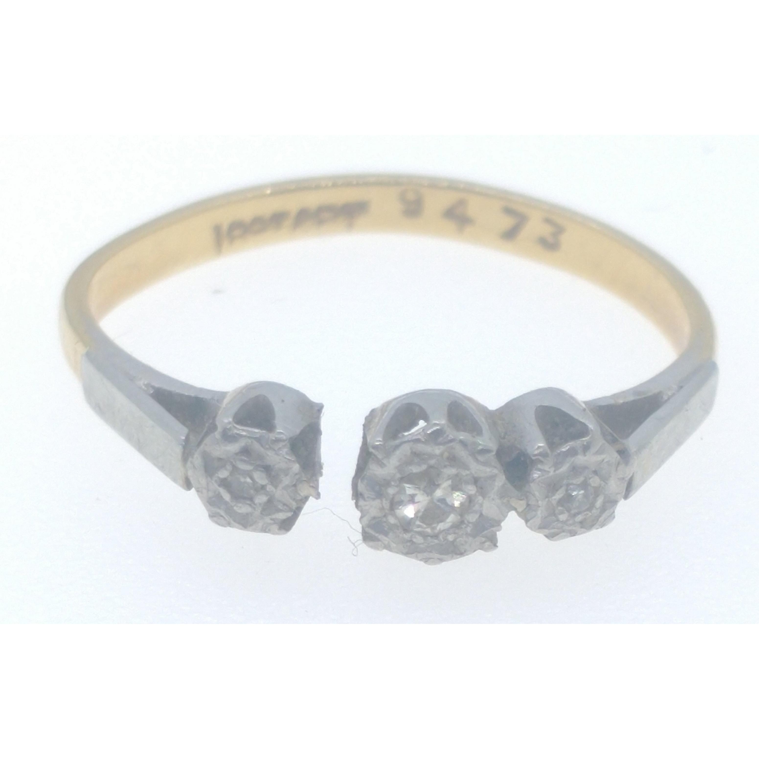 An 18ct stamped yellow gold engagement ring, set in platinum with three diamonds inset, the middle diamond is the larger flanked with two smaller diamonds (Diamonds tested) Ring size L (Point to note the ring requires a small repair to join the setting)