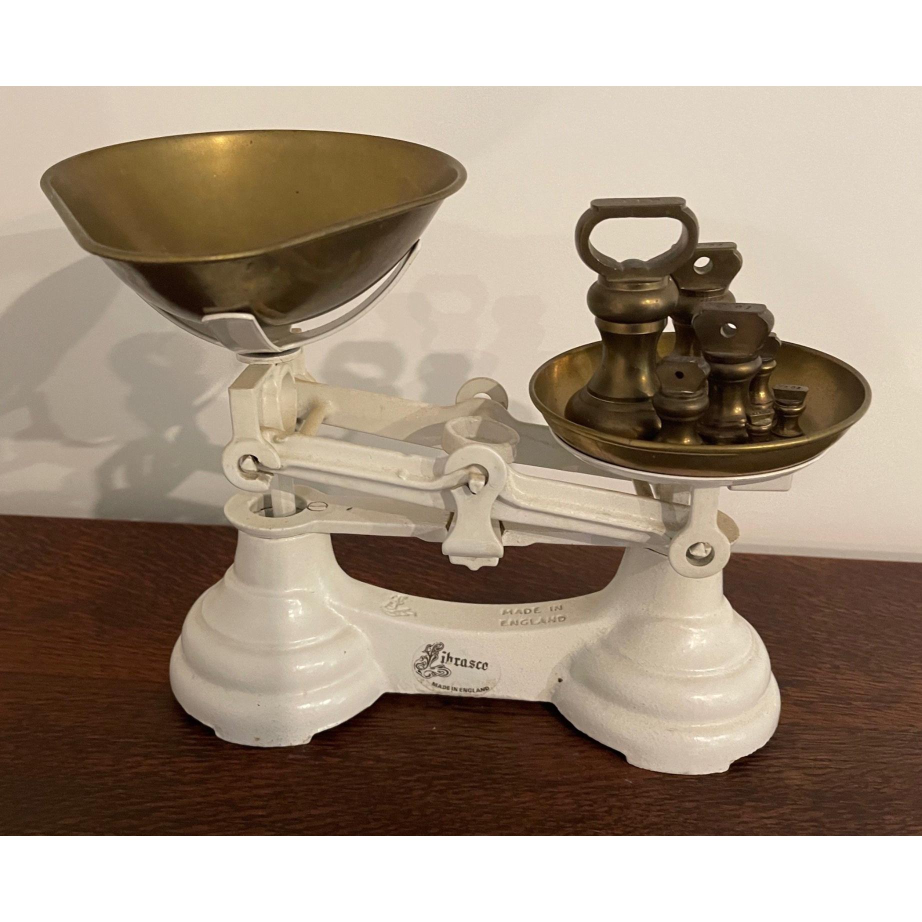 A set of LIBRASCO scales with brass pans and a set of brass weights