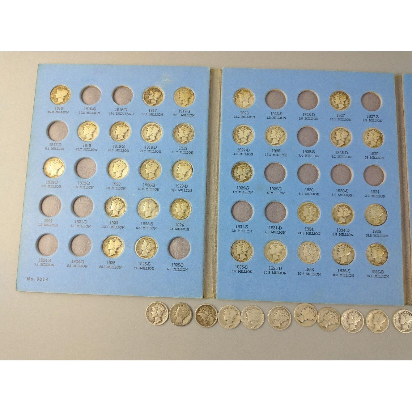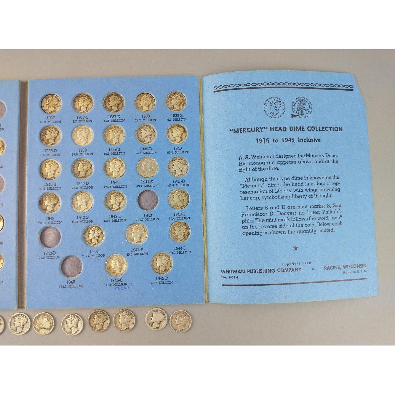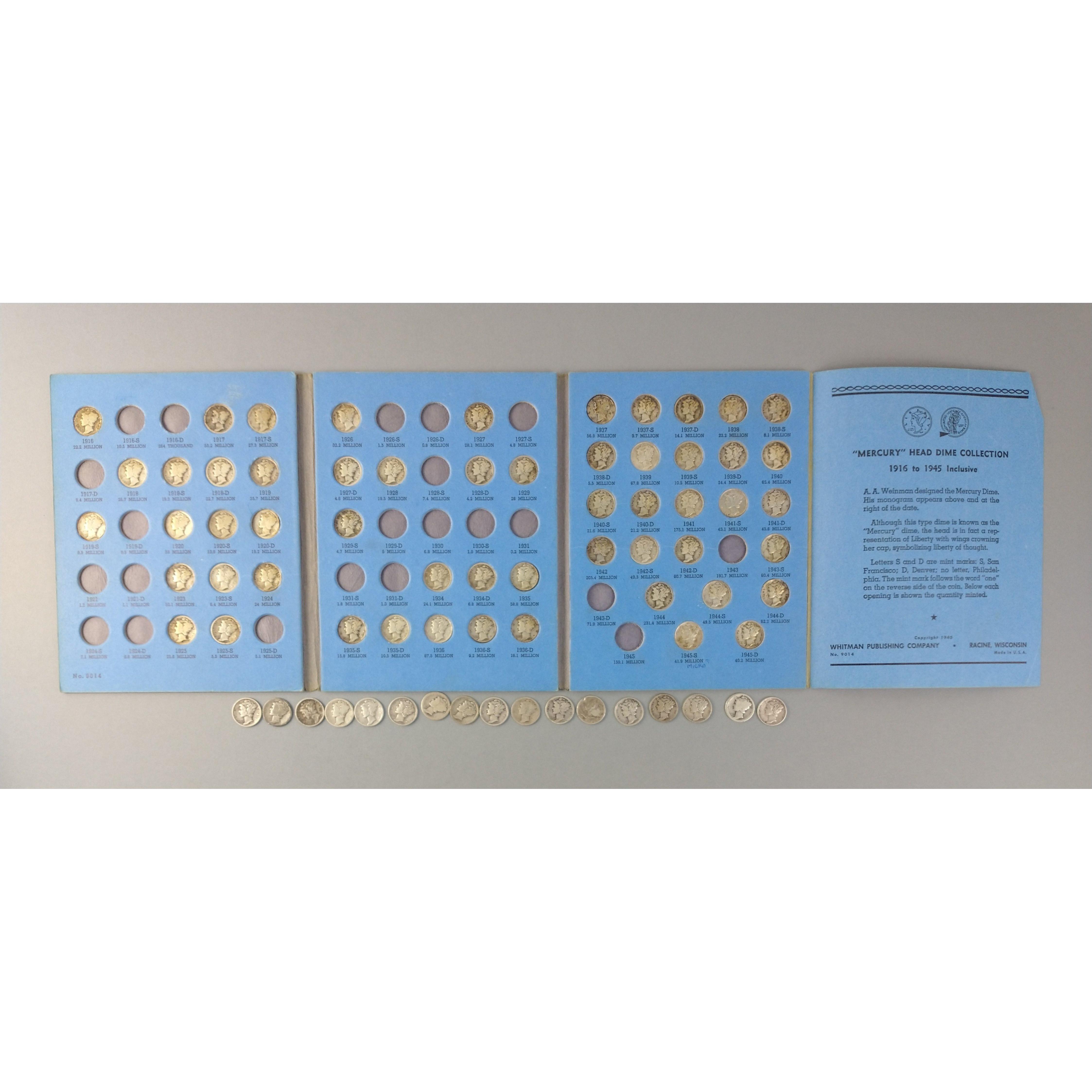 A WHITMAN folder of UNITED STATES MERCURY HEAD DIMES 1916 - 1945. The folder is not complete as it contains 55 of 77 coins. Mixed condition / grades. Lot also includes 17 additional loose duplicated coins. A lovely little collection.