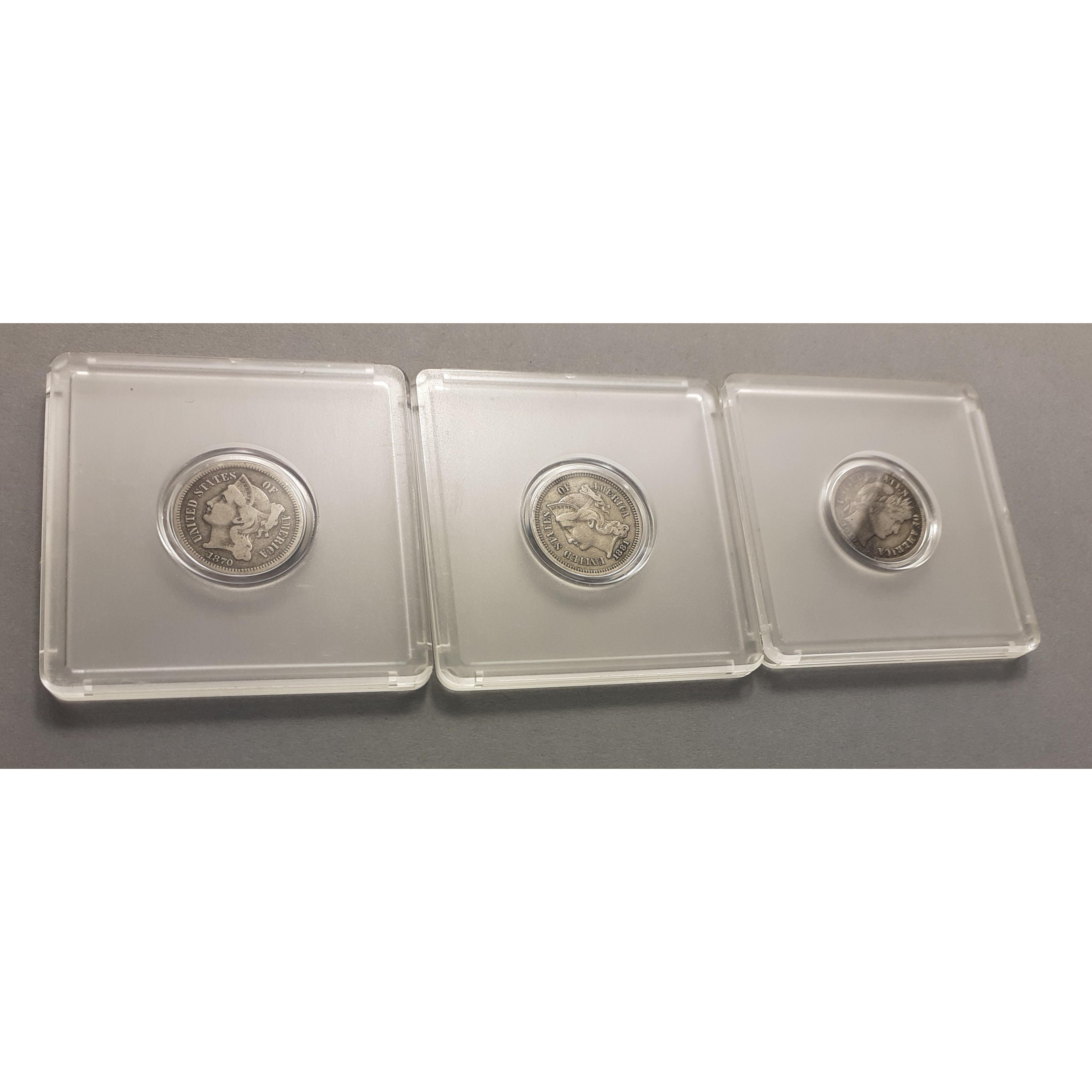 A lovely old collection of 3 older UNITED STATES coins to include an 1870 3 Cent coin with light wear overall; an 1881 3 Cent coin with only minor wear and a 1910 Dime Philadelphia Mint with toning and wear.