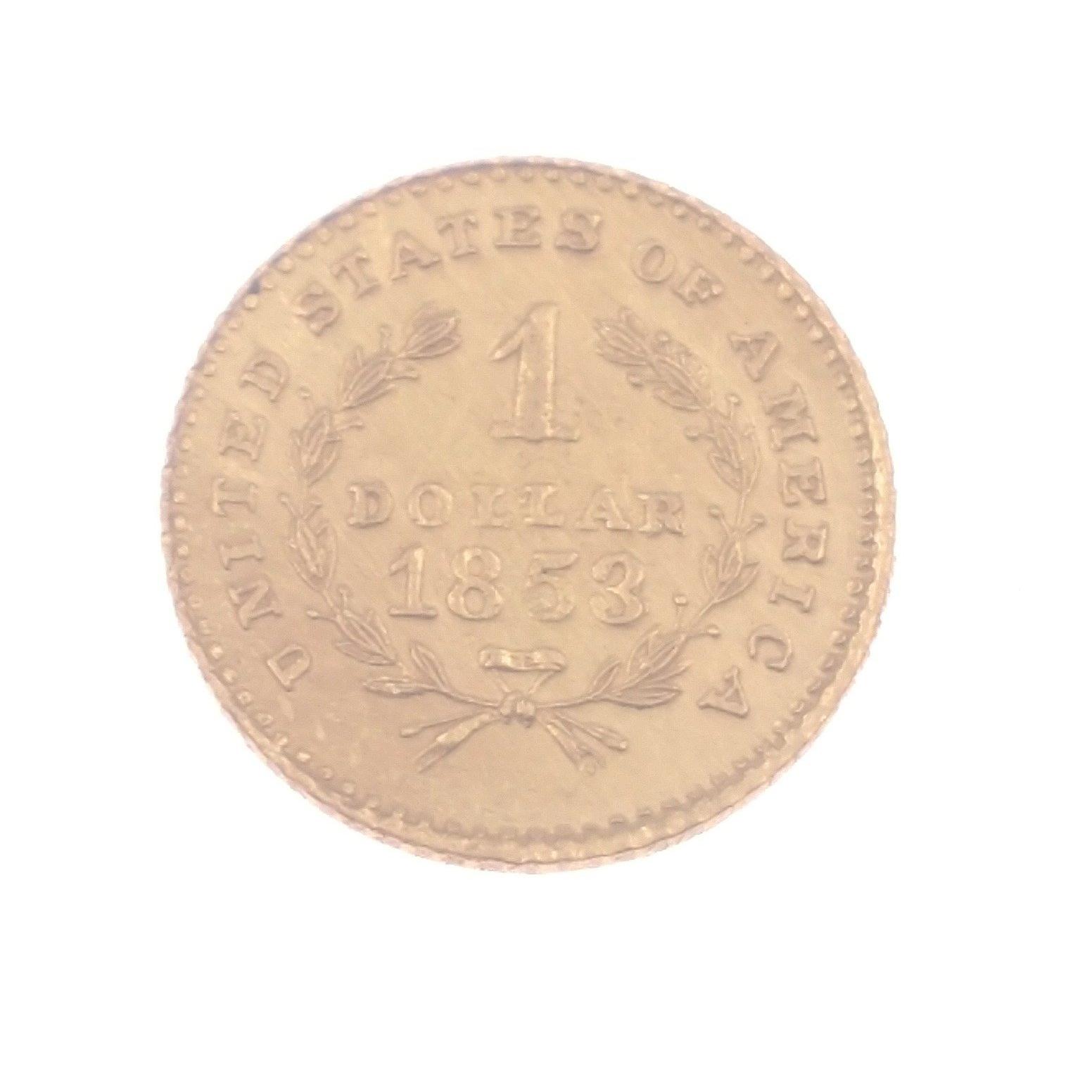 A small yellow metal coin marked 1 DOLLAR 1853. Measures 14mm approx and weighs 1.44g approx