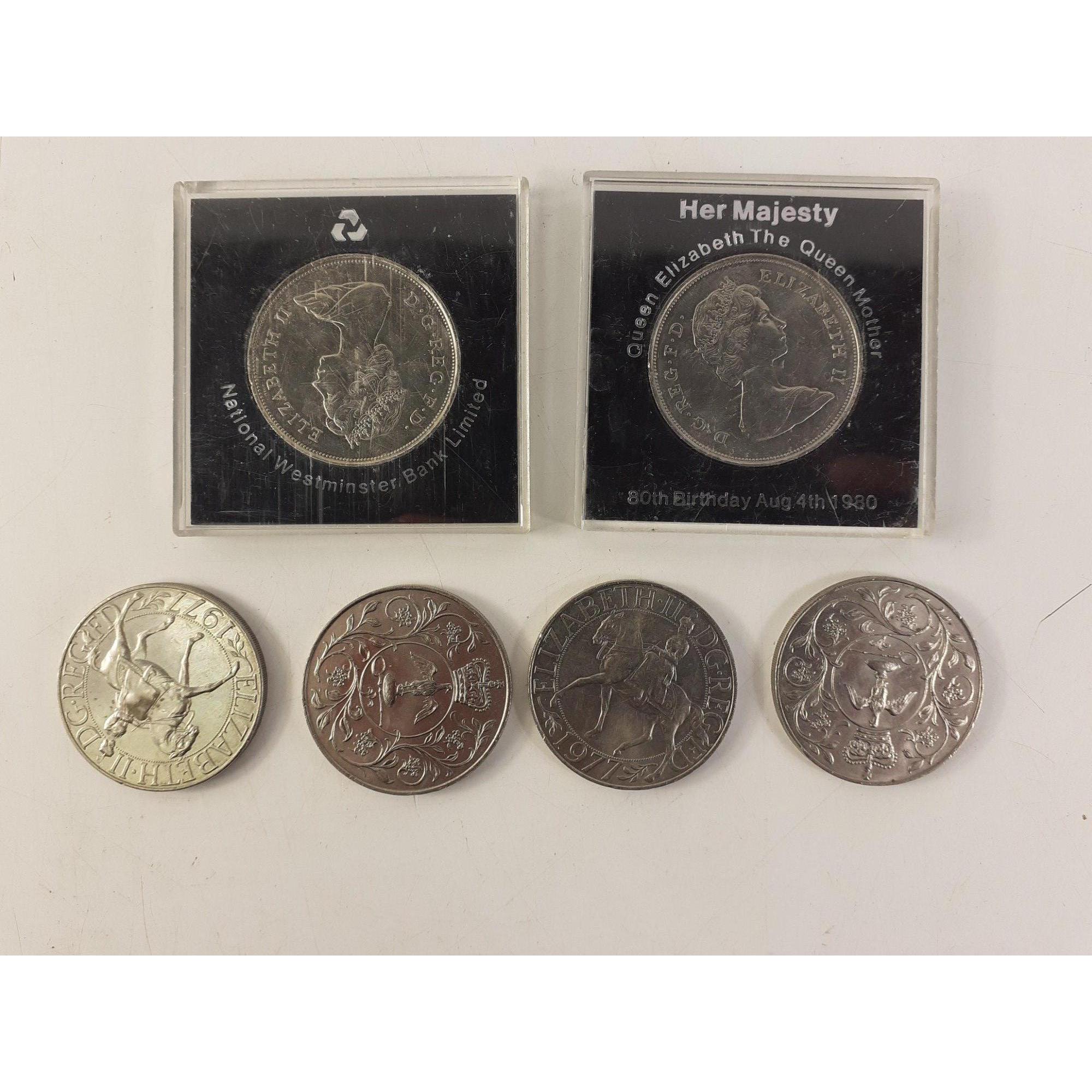A small collection of six UK Crown coins to include 2 x 1980 Queen Mother crowns, 4 x 1977 CrownsApprox 6 pieces