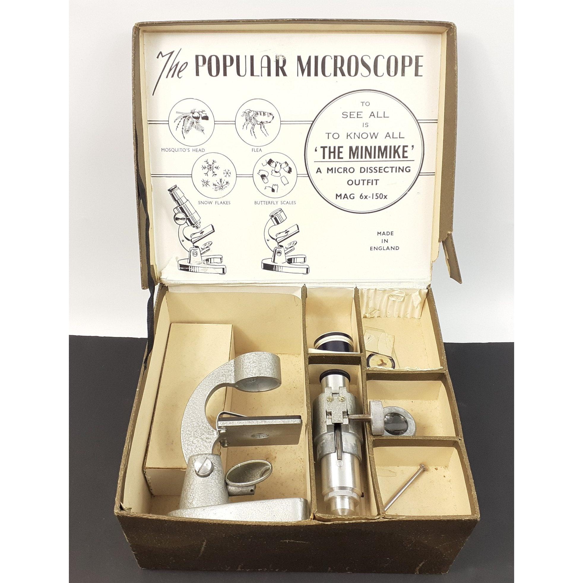 A small vintage MINIMIKE Micro dissecting microscope with attachments in box.