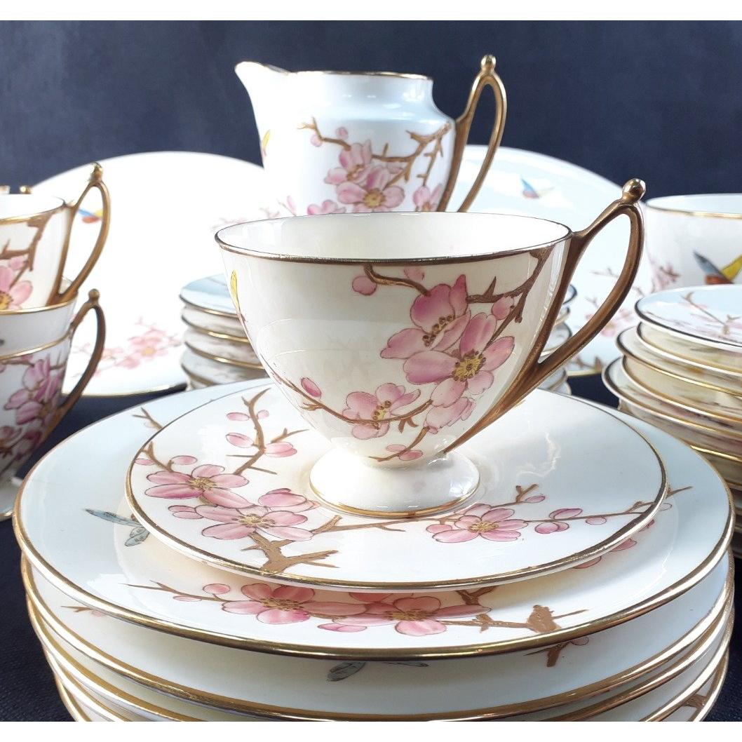 An Oriental style eggshell tea service decorated with flying insects and hand-applied gilt, 2 sandwich plates (23cm), 12 side plates, 10 saucers, 11 teacups some with damage and older staple repairs, a large sugar bowl and milk jug